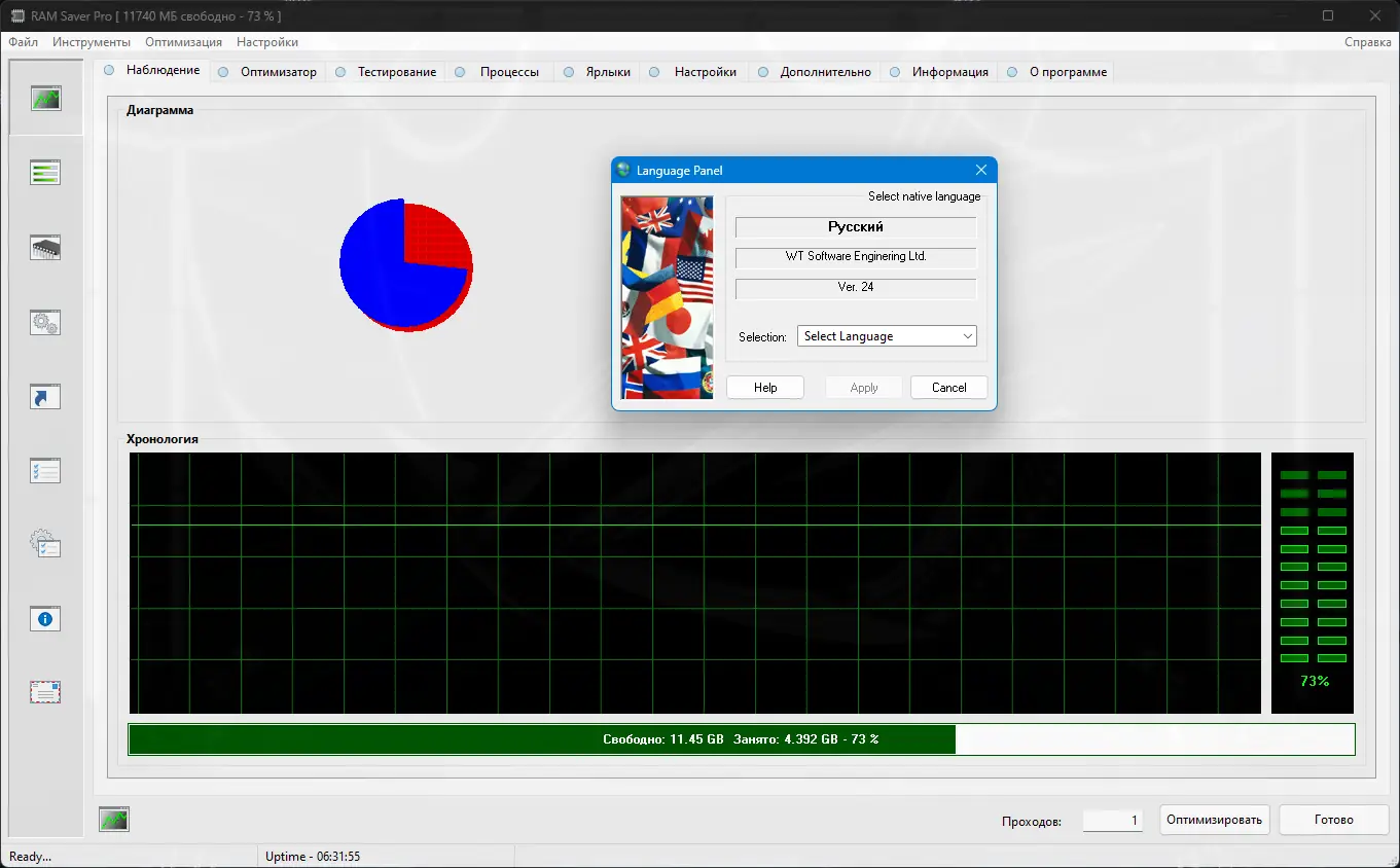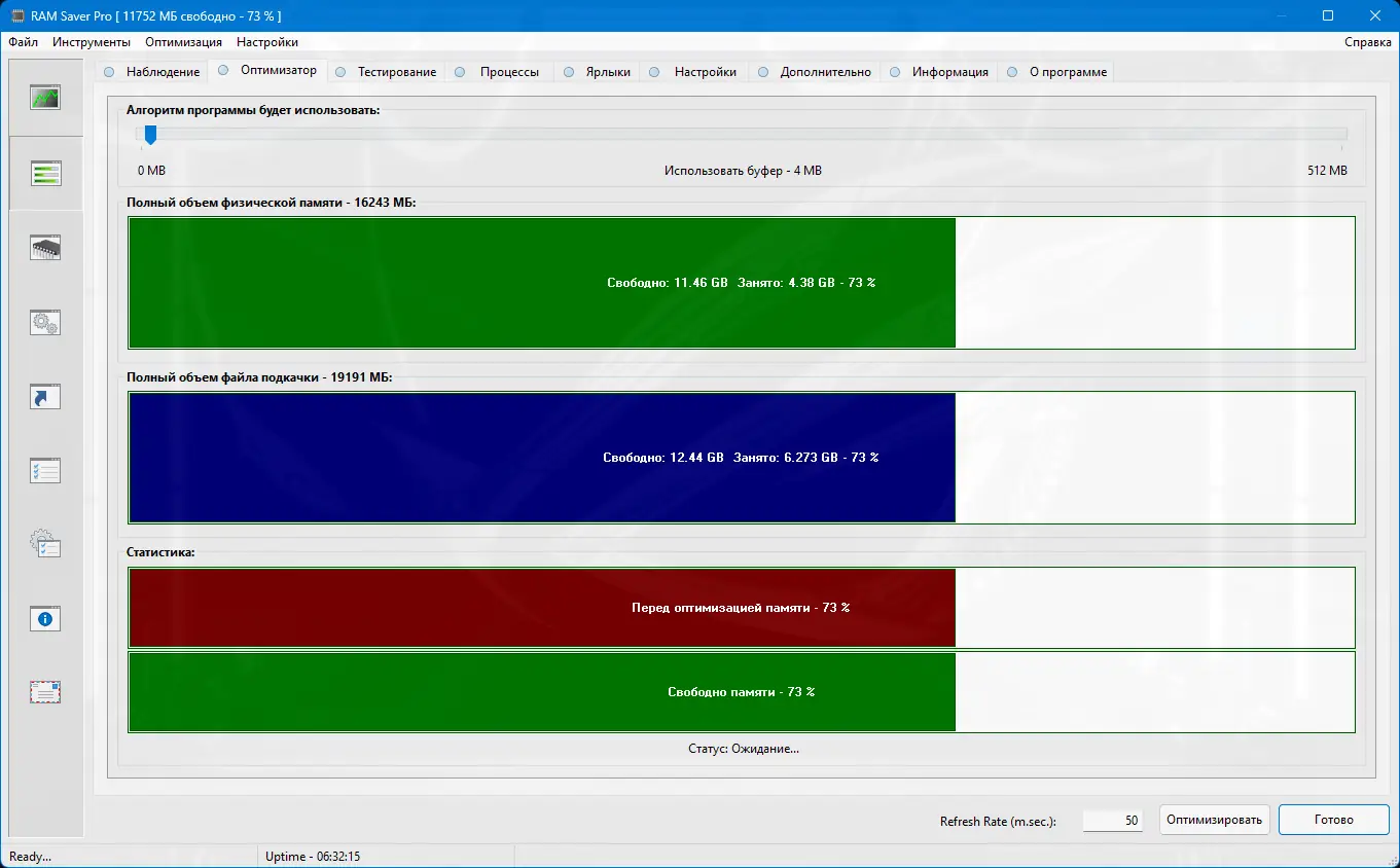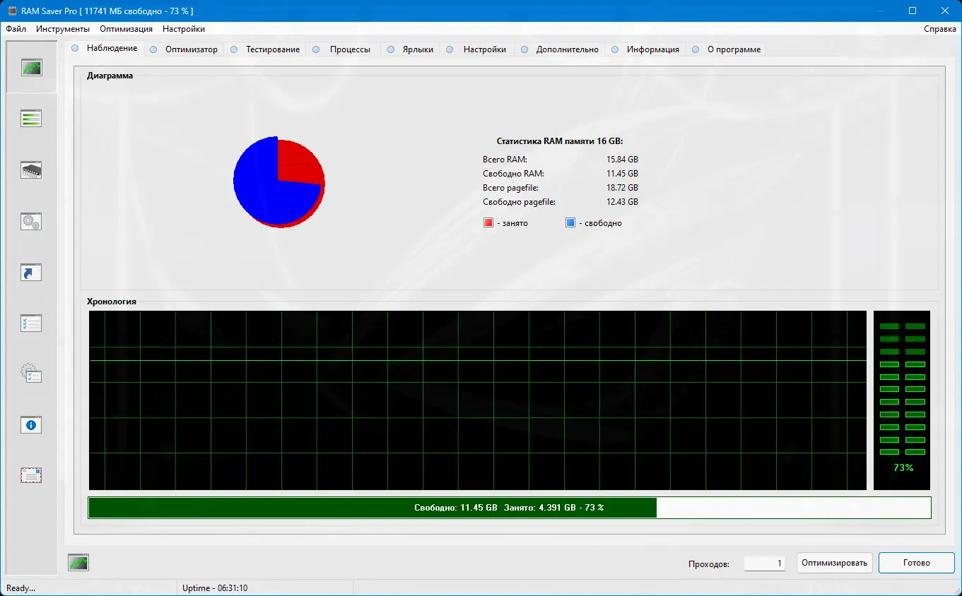 Программа RAM Saver эффективно решает проблему нехватки оперативной памяти за счёт комплексного подхода к её управлению. Она анализирует текущую загрузку системы, выявляет процессы, потребляющие избыточные ресурсы, и при необходимости перемещает неактивные данные во внешний файл подкачки. Это позволяет освободить пространство в физической памяти для приоритетных приложений, таких как графические редакторы, игры или виртуальные машины.