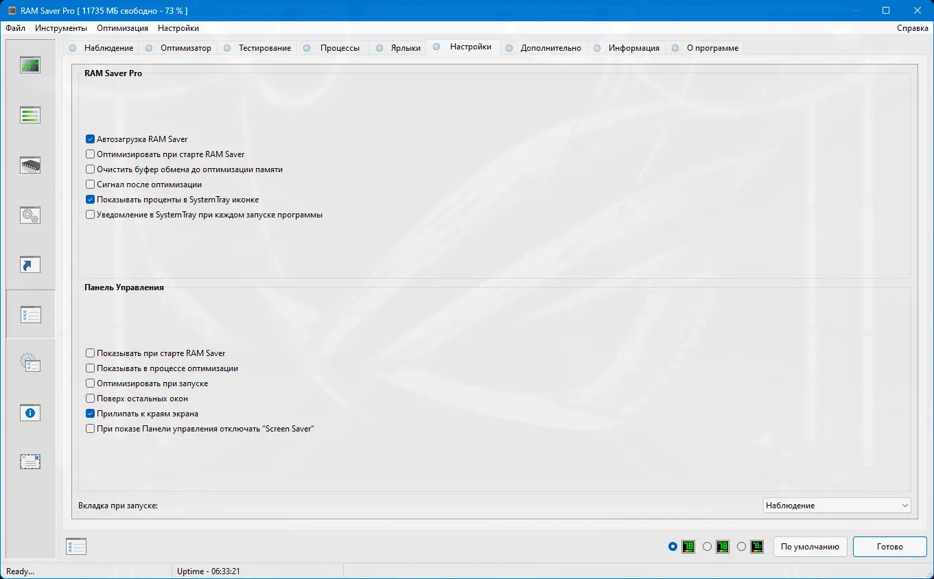 Интерфейс программы интуитивно понятен и не требует углублённых знаний для базового функционирования. После запуска RAM Saver начинает фоновую оптимизацию, отображая текущее состояние памяти в компактном окне или на рабочем столе. Для настройки режимов работы используется специализированная панель управления, где можно активировать автоматическую очистку, настроить расписание или задать условия для интеллектуальной оптимизации. Чтобы понять, как настроить, достаточно изучить вкладки «Настройки» и «Профили», где доступны параметры для ручного и полуавтоматического режимов.