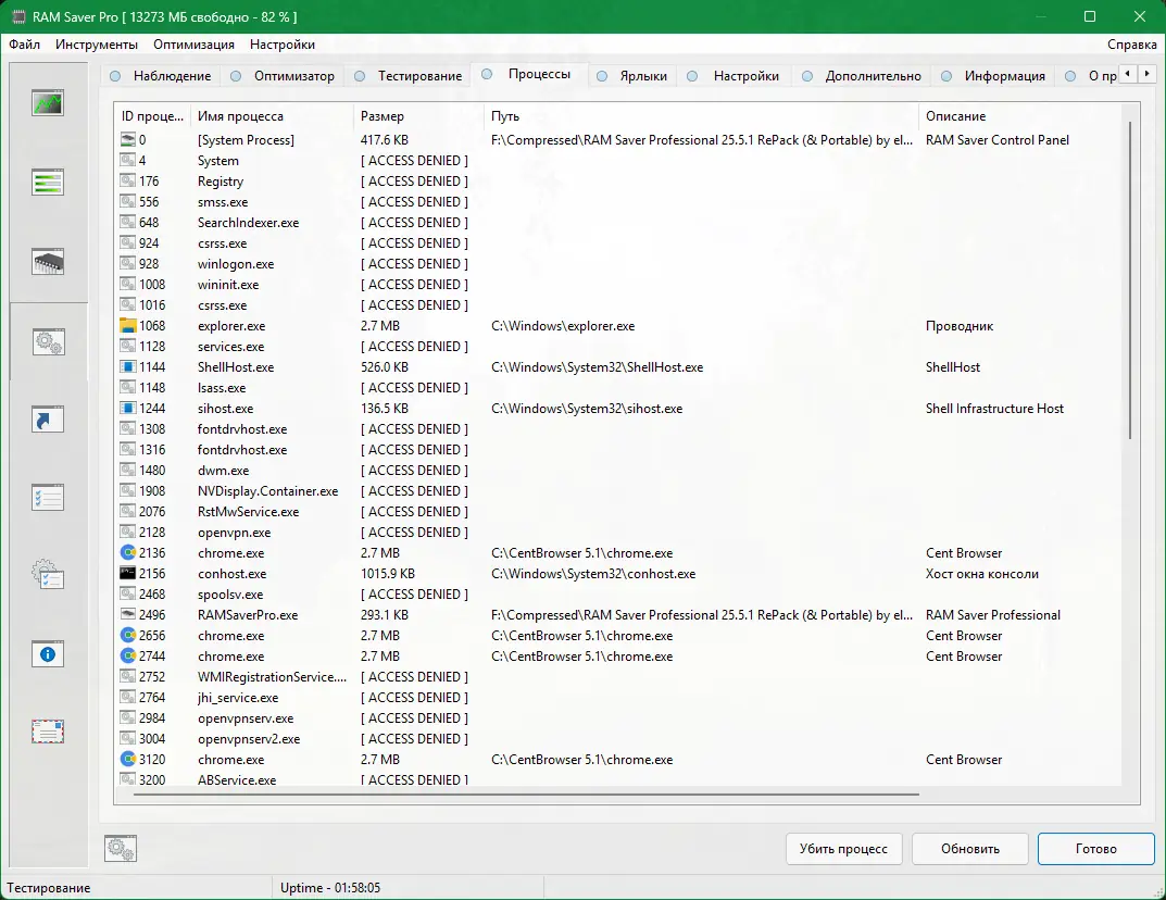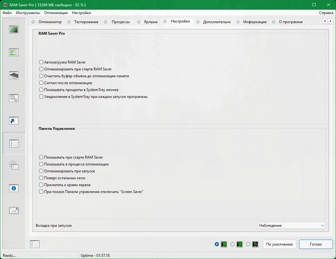 RAM Saver обладает широким функционалом, позволяющим эффективно управлять ресурсами оперативной памяти. Утилита сочетает в себе как базовые, так и продвинутые инструменты, подходящие как для повседневного использования, так и для решения специфических задач. Её интерфейс интуитивно понятен, а наличие портативной версии расширяет сценарии применения.