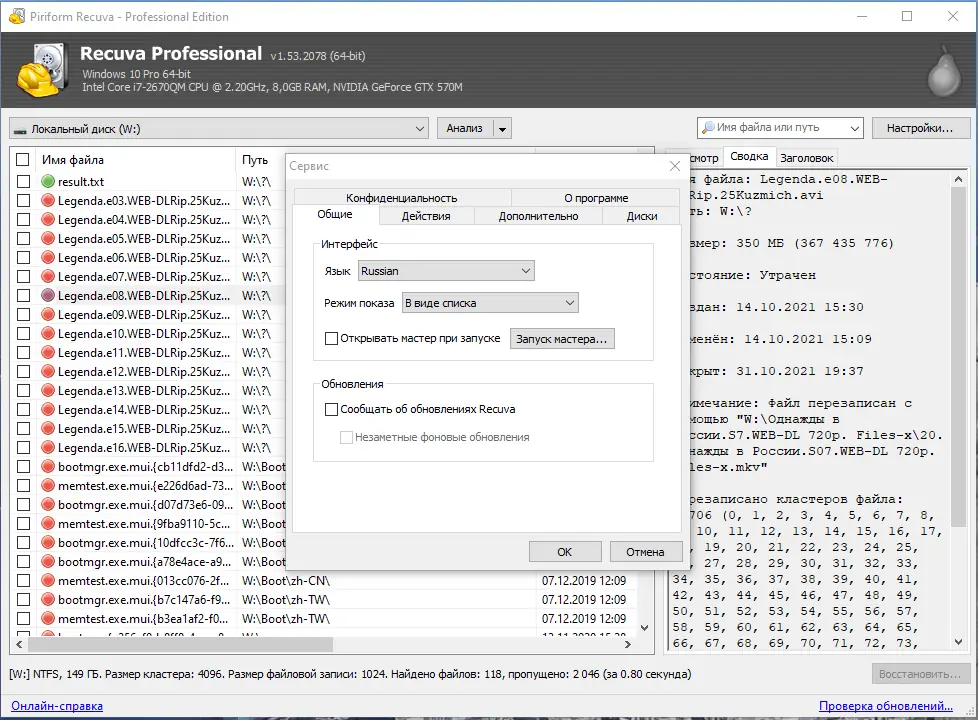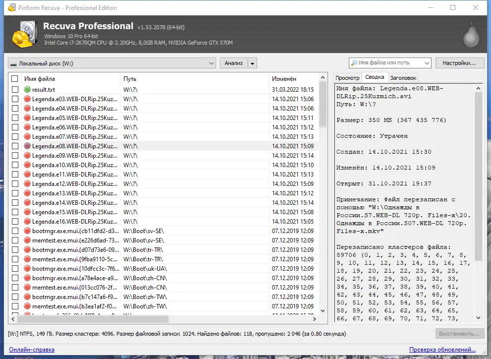 - Отображает состояние каждого найденного файла для оценки шансов на восстановление
