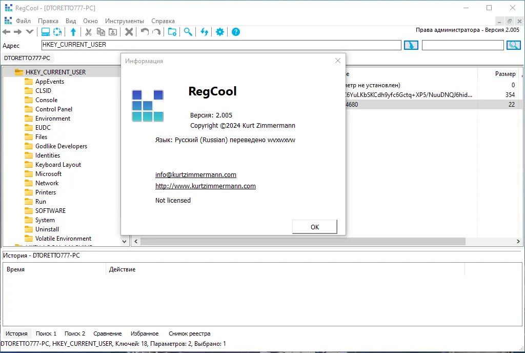 - Поддержка операций вырезания, копирования, вставки, перемещения и переименования ключей упрощает навигацию и редактирование.