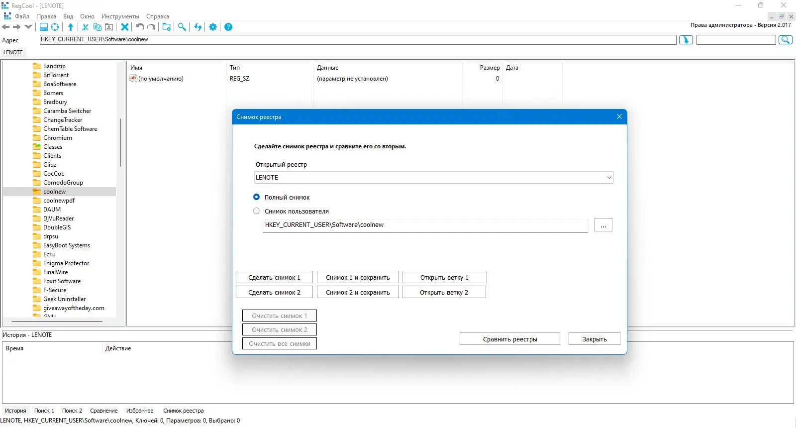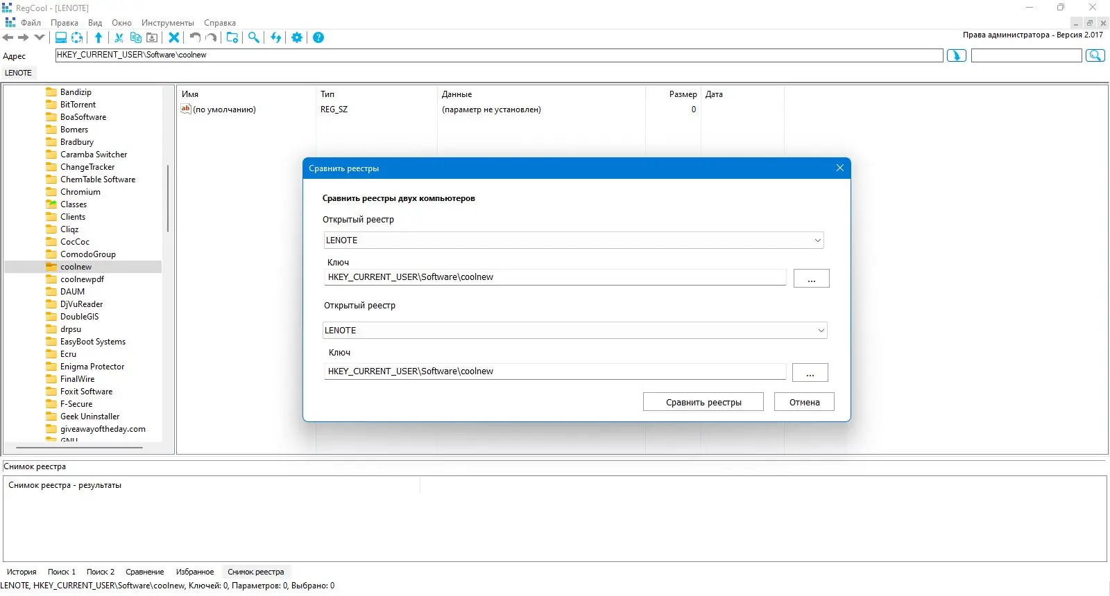 Особое преимущество RegCool — возможность сравнивать реестры, что делает её незаменимой при диагностике системных изменений.