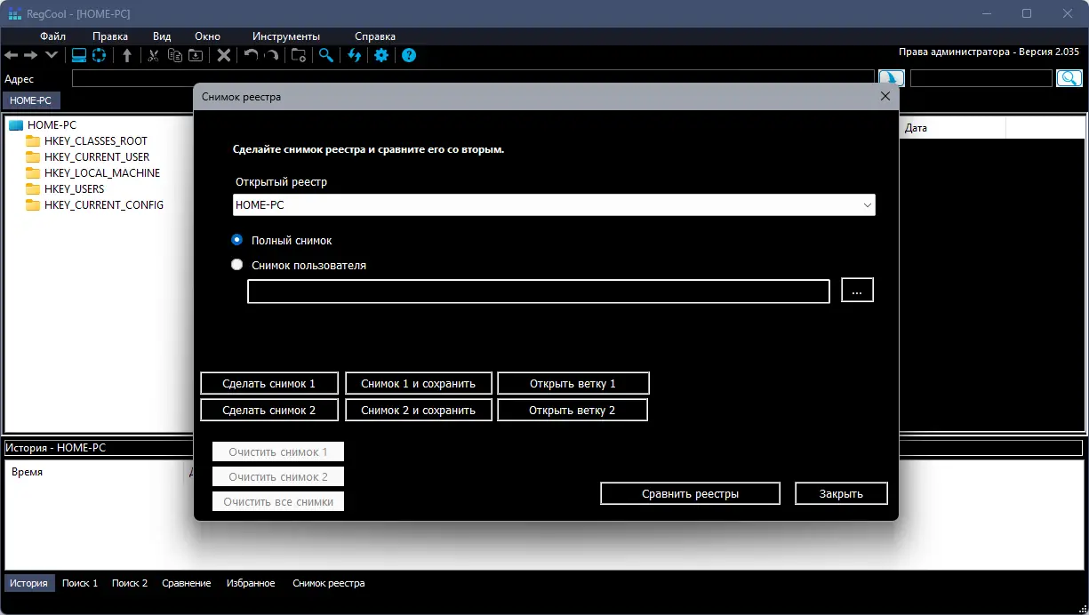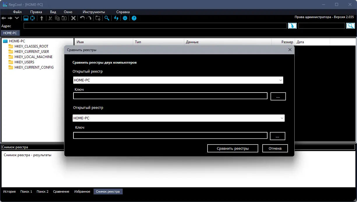 - Поддержка сравнения двух веток реестра или его снимков, что особенно полезно при анализе изменений после установки программ или обновлений.