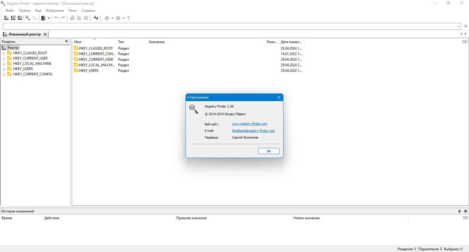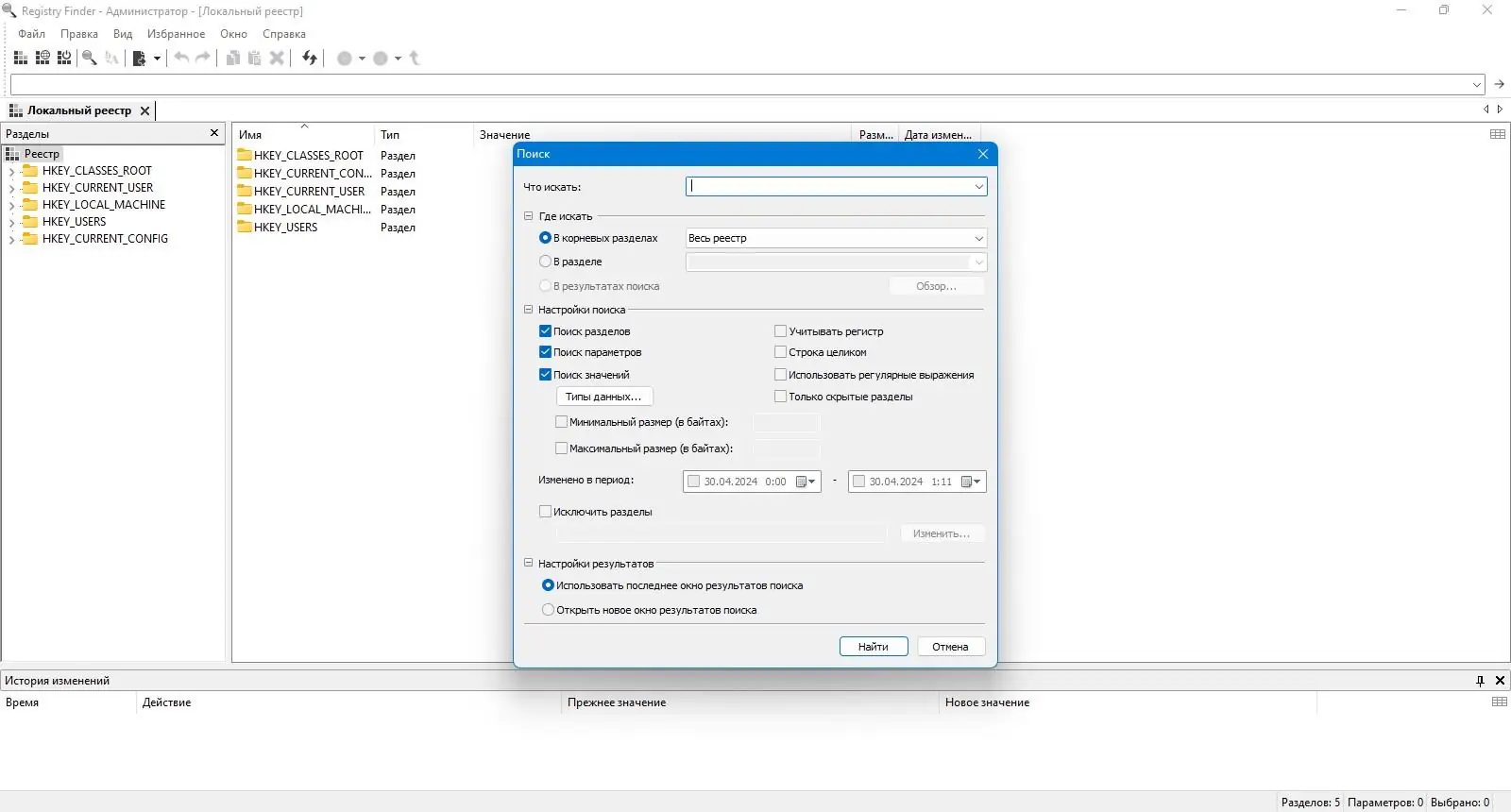 - Поддержка поиска по ключам, значениям, данным и датам изменения.