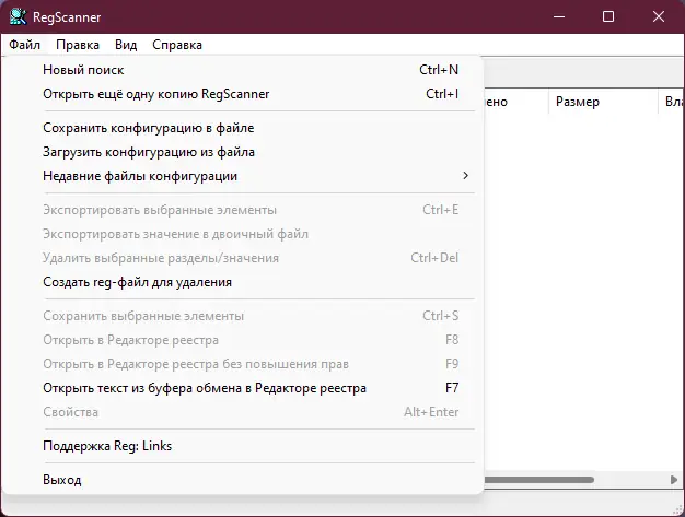 Как пользоваться утилитой, становится понятно уже после первого запуска. Интерфейс интуитивно понятен: достаточно указать строку поиска, выбрать дополнительные фильтры — например, тип значения или диапазон длины в байтах — и запустить сканирование. Результаты отображаются в таблице, где можно сортировать, копировать или экспортировать записи в текстовый файл. Нажатие на элемент открывает соответствующий раздел в редакторе реестра, что упрощает внесение изменений. Для повторного поиска добавлена опция «Обновить» (F5), которая перезапускает сканирование с сохранёнными параметрами.