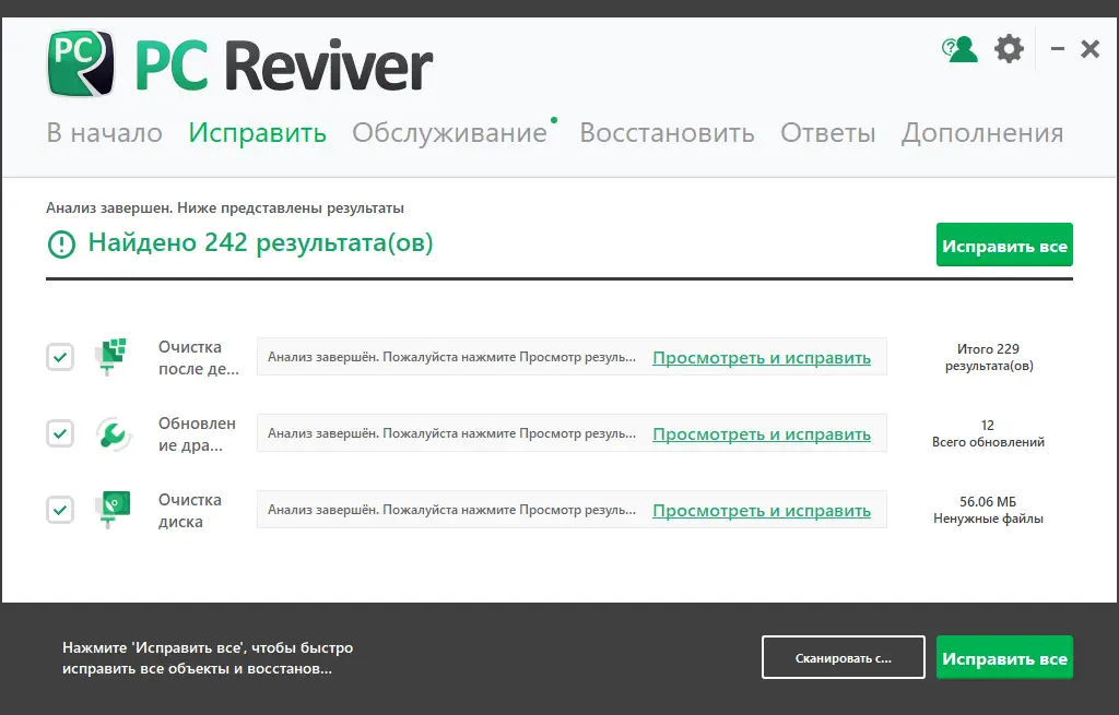 ReviverSoft PC Reviver разработан для комплексного обслуживания операционной системы, обеспечивая стабильность, производительность и безопасность компьютера. Утилита проводит глубокое сканирование системы, включая реестр, драйверы, временные файлы и параметры автозагрузки. После анализа она предлагает пользователю список выявленных проблем с рекомендациями по их устранению.