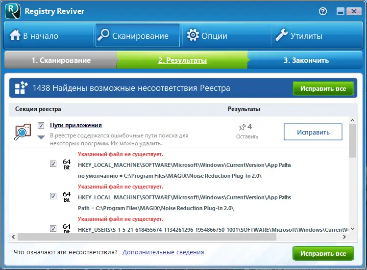 - Проводит глубокое сканирование реестра на наличие ошибок и неактуальных записей