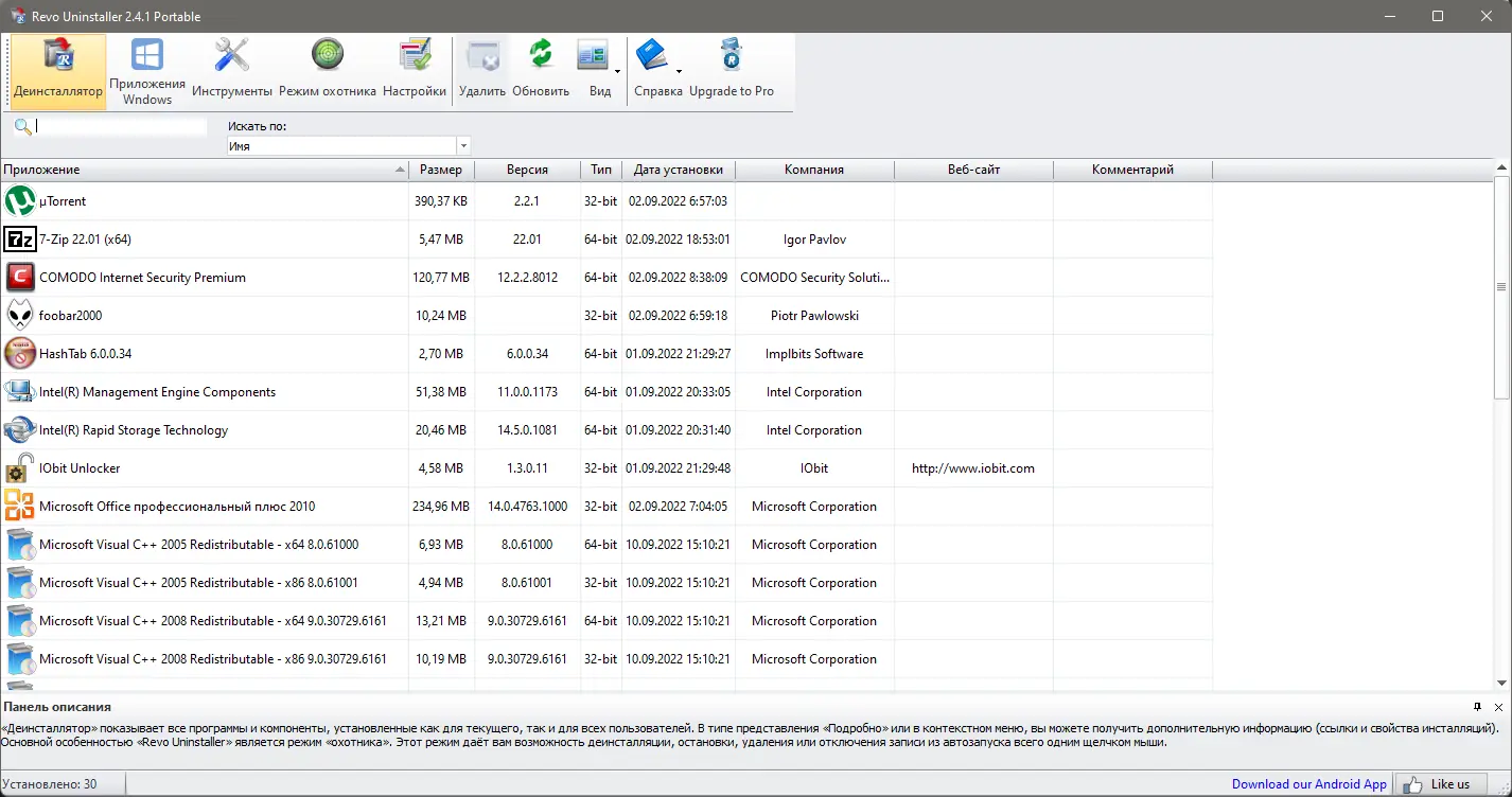 - Позволяет просматривать детальную информацию обо всех установленных программах, включая размер, дату установки и издателя.