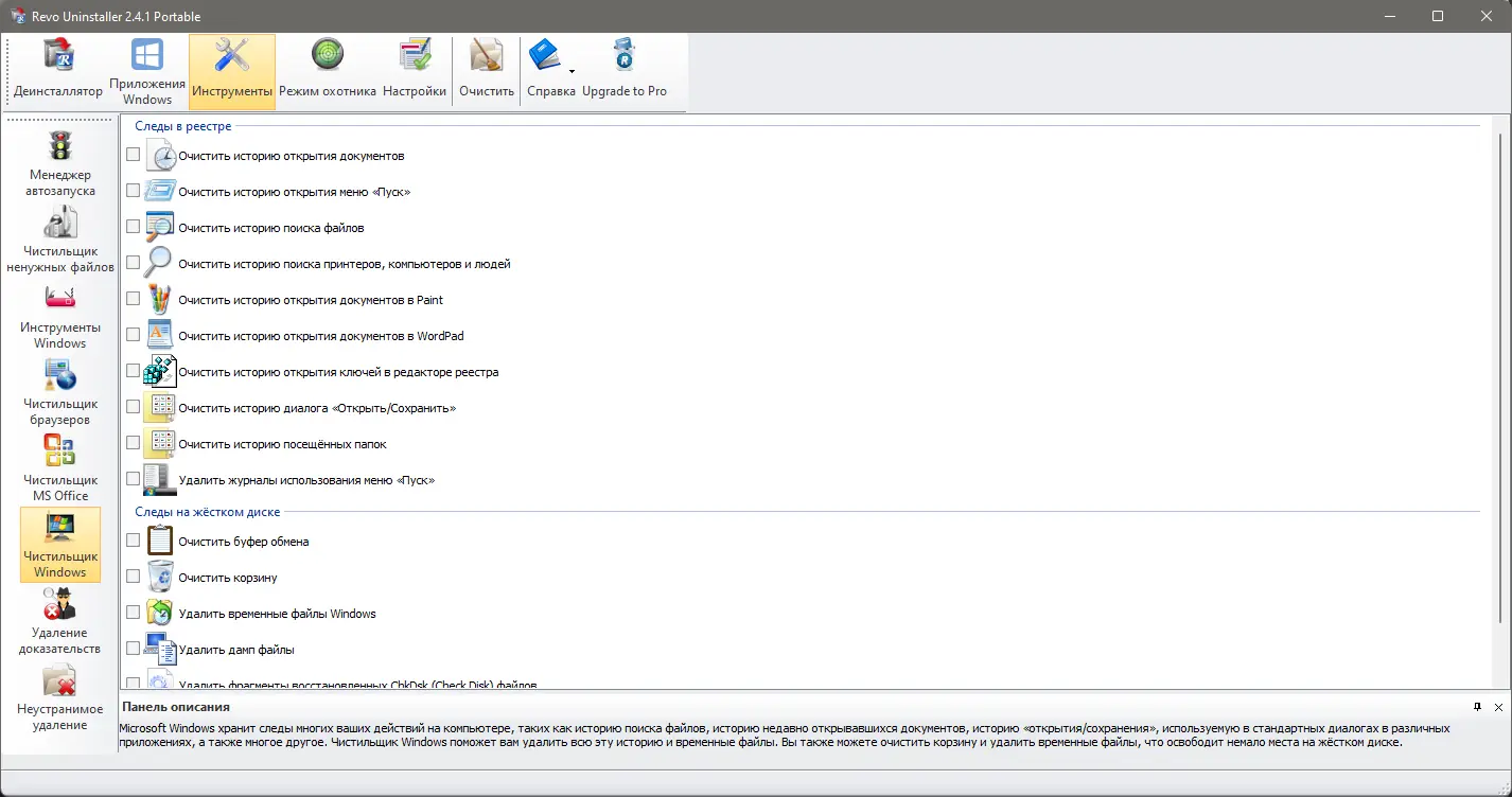 Revo Uninstaller не только удаляет программы, но и помогает поддерживать систему в оптимальном состоянии благодаря встроенным инструментам очистки и оптимизации.