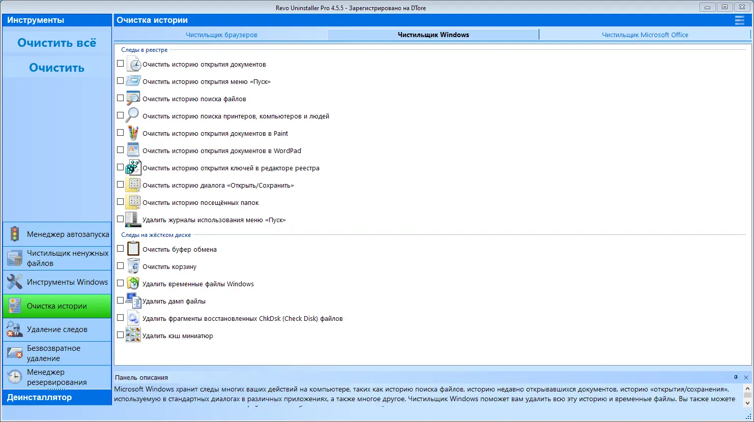 - Эффективное удаление следов программ из реестра и файловой системы.