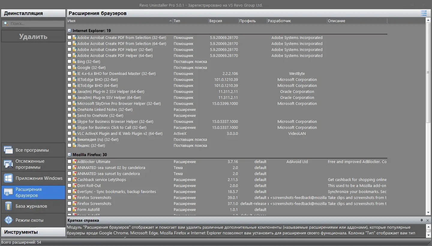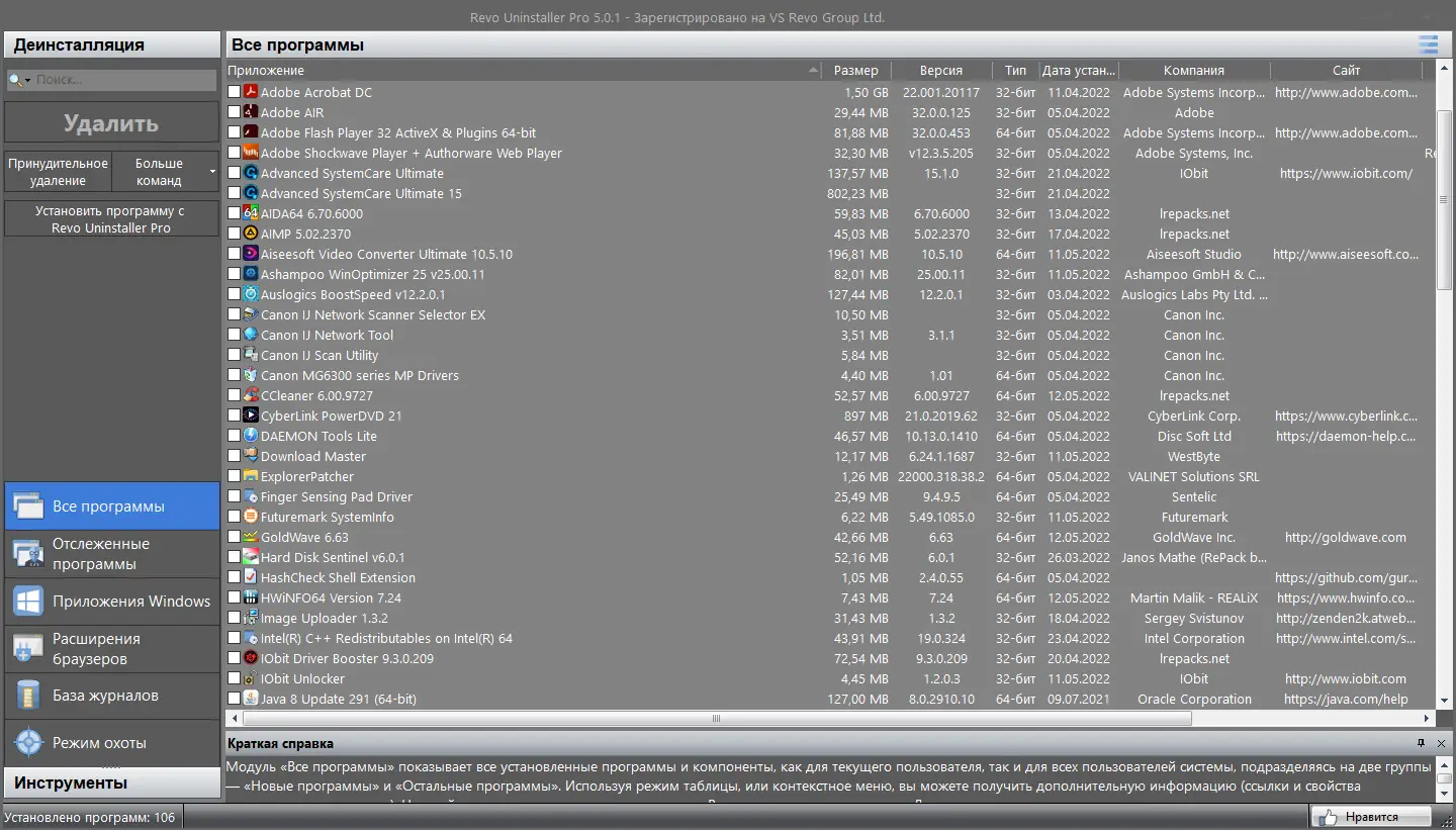 Revo Uninstaller — это мощная утилита для полного и безопасного удаления программ с компьютера, обеспечивающая очистку остатков в реестре, файлах и папках. Программа поддерживает расширенное сканирование, принудительную деинсталляцию и включает в себя набор дополнительных инструментов для оптимизации системы. Режим «Охотник» и поддержка журнала установок позволяют эффективно удалять даже те приложения, которые не отображаются в стандартном списке установленных программ.