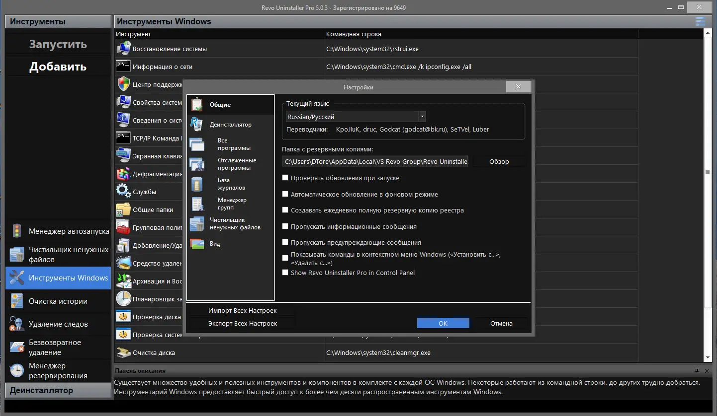 Revo Uninstaller — это мощная утилита для полного и безопасного удаления программ с компьютера. Программа не только удаляет приложения, но и очищает систему от остаточных файлов, папок и записей реестра, которые остаются после стандартной деинсталляции. Благодаря продвинутому сканированию и уникальному «режиму охотника» она обеспечивает высокую точность и контроль над процессом удаления. Дополнительные инструменты помогают оптимизировать работу системы, управлять автозагрузкой и удалять временные данные. Revo Uninstaller поддерживает множество функций, включая безопасное удаление и очистку приватной информации.
