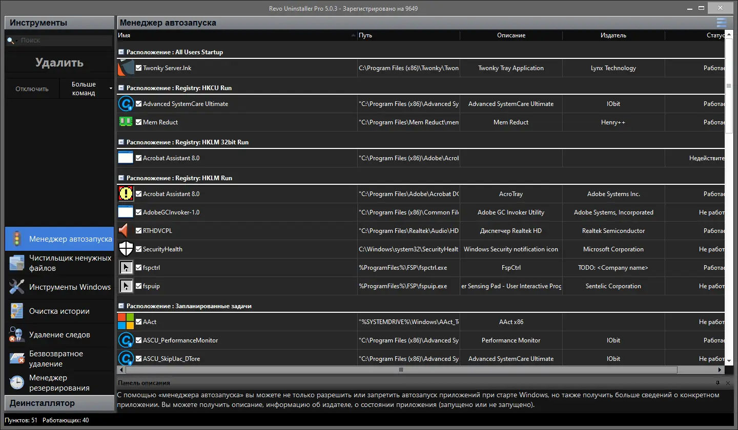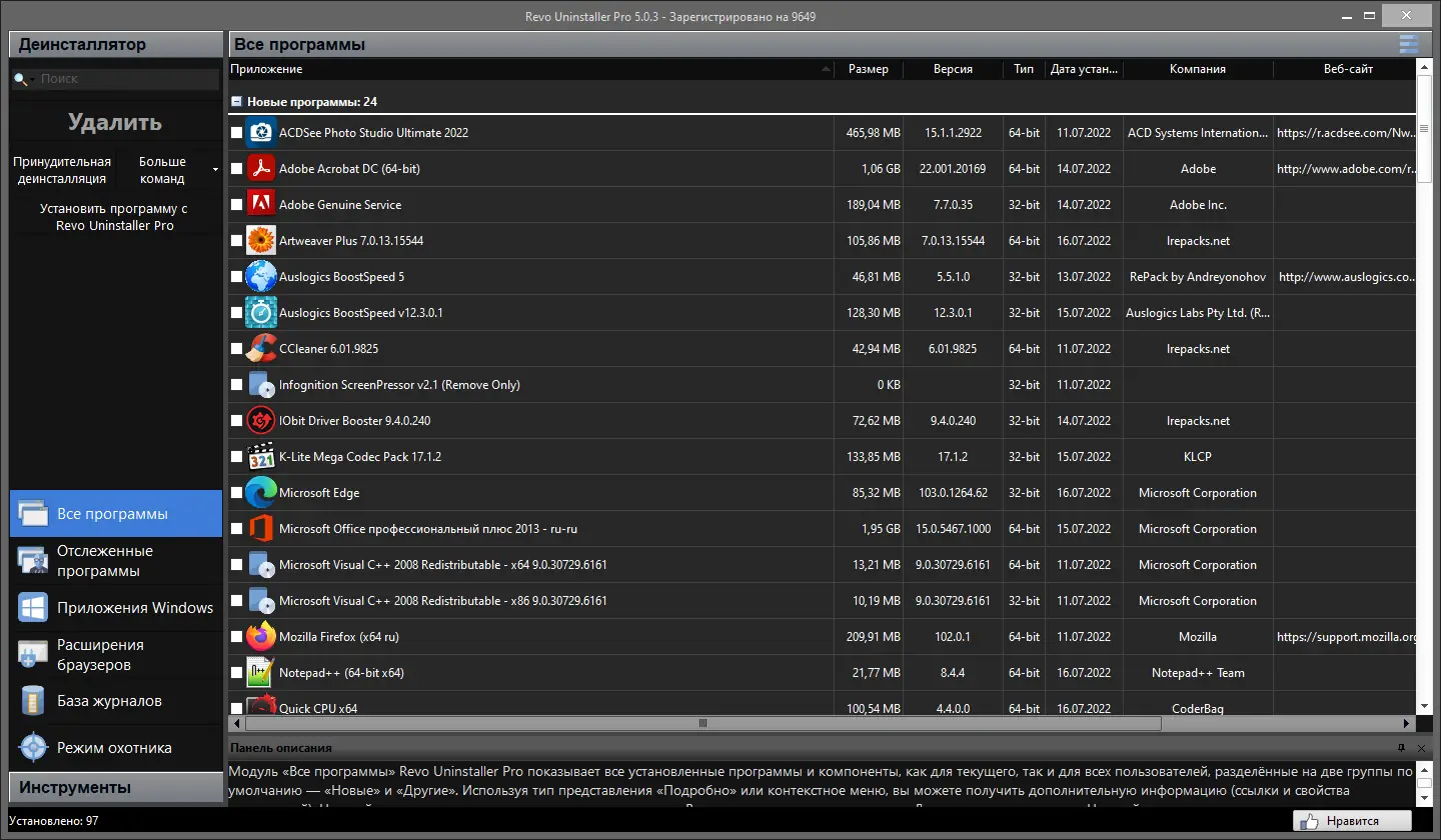 Revo Uninstaller предлагает широкий набор функций, повышающих эффективность управления программами и состоянием системы. Особенно выделяется высокая точность удаления, поддержка множества браузеров и приложений, а также наличие дополнительных утилит в одном интерфейсе. Программа экономит место на диске и улучшает производительность за счёт удаления мусорных файлов и ненужных автозагрузок. При этом она остаётся понятной даже для новичков. Однако полный функционал доступен только в версии pro, а базовая версия имеет ограничения по сравнению с платной.