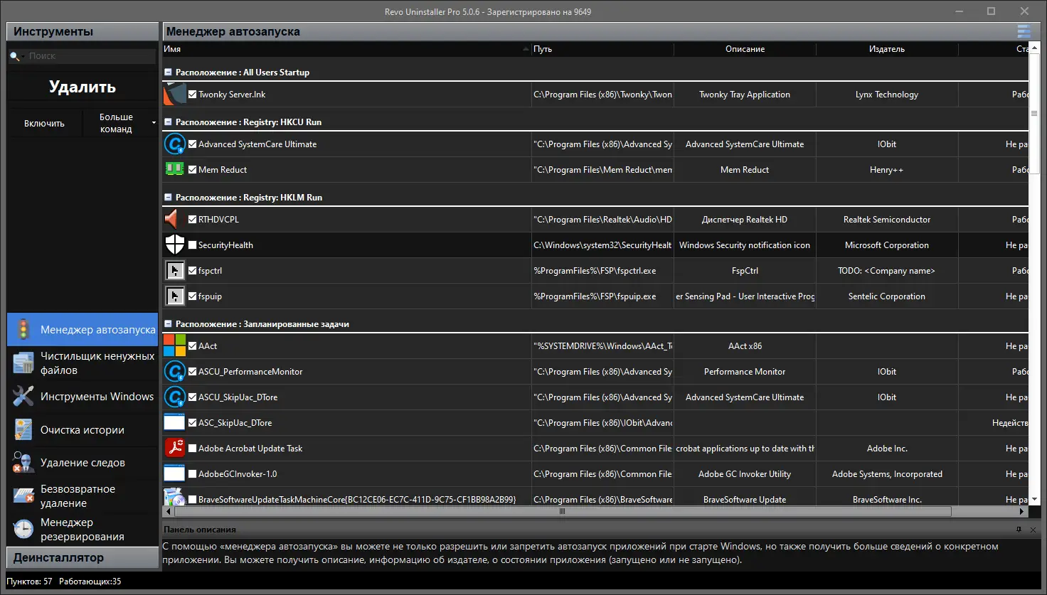 - Позволяет удалять приложения с очисткой остатков в реестре и файловой системе.