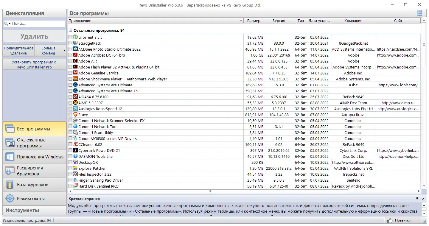 Revo Uninstaller — это мощная утилита для полного и безопасного удаления программ с компьютера. Программа эффективно удаляет ненужные приложения и очищает систему от остаточных файлов, папок и записей реестра, которые стандартные средства деинсталляции оставляют после себя. Её продвинутые функции, включая режим охотника и глубокое сканирование, обеспечивают высокую точность и надёжность при очистке системы.