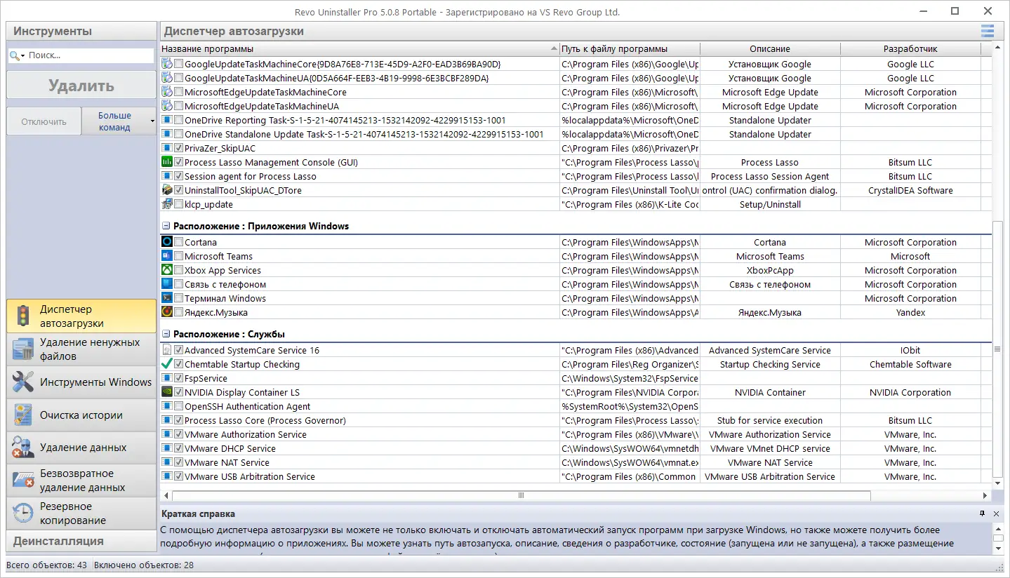 - Включает инструменты для управления автозагрузкой и анализа установленного ПО.