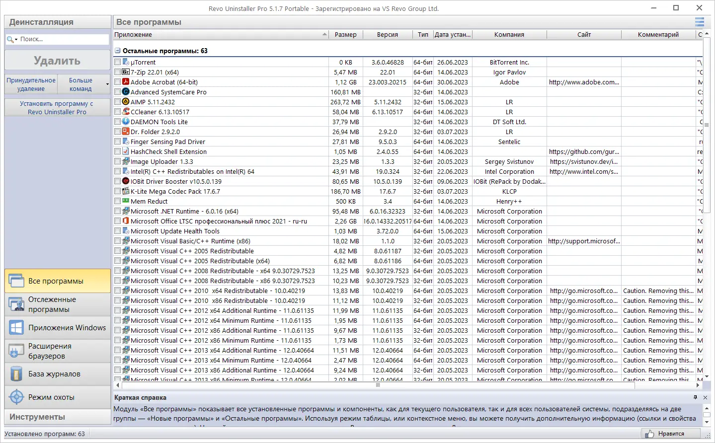 Revo Uninstaller — это эффективная система для полного удаления приложений с компьютера. Программа сканирует реестр и файловую систему до и после деинсталляции, обеспечивая чистое удаление без остатков. Она поддерживает продвинутые режимы очистки, включая принудительное удаление и работу с автозагрузкой. С её помощью можно избавиться от временных файлов, следов программ и конфиденциальных данных. Утилита предлагает встроенные инструменты для оптимизации системы и управления установленным ПО. Подходит как для новичков, так и для опытных пользователей.