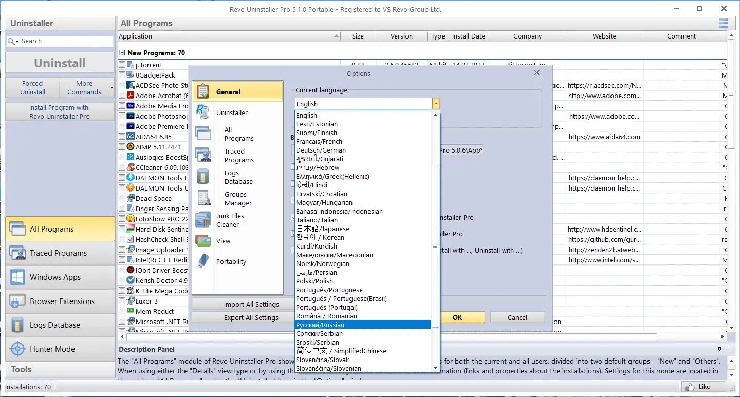 Использование Revo Uninstaller не требует специальных знаний. После запуска программа отображает список всех установленных приложений. Пользователь выбирает нужное ПО и запускает процесс деинсталляции. Перед началом удаления выполняется резервное копирование ключей реестра. После завершения стандартного удаления запускается глубокое сканирование системы для поиска остатков. Найденные элементы можно просмотреть и удалить вручную или автоматически. Режим охотника активируется отдельно и позволяет щёлкнуть по иконке программы на рабочем столе или в трее, чтобы вызвать контекстное меню с действиями. Дополнительные утилиты, такие как чистильщик автозагрузки, история браузеров и безопасное удаление файлов, доступны на отдельной панели. Настройки позволяют выбрать язык интерфейса, включая русский, и настроить поведение инструментов.