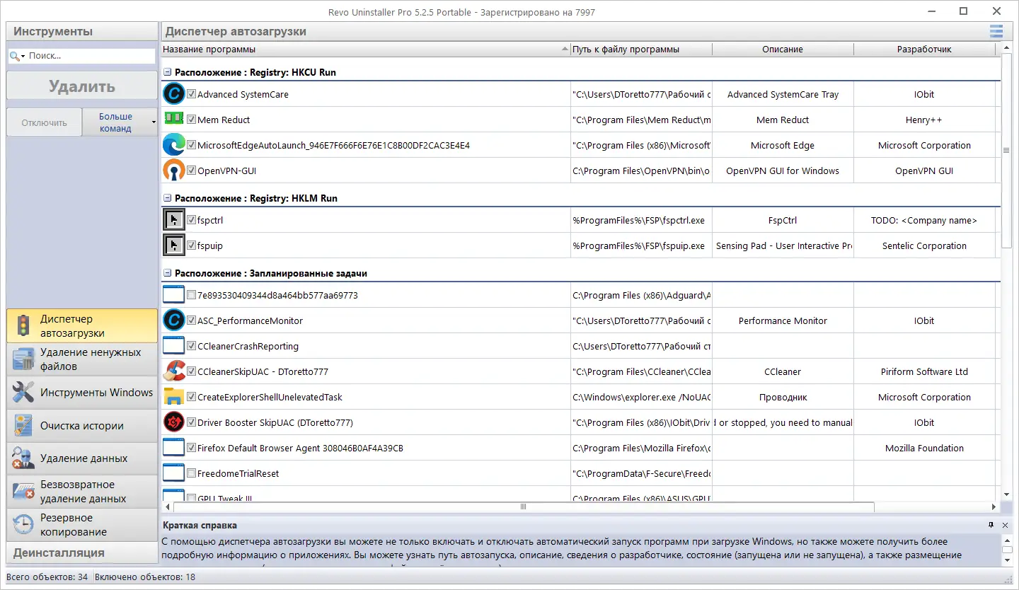 - Наличие встроенных утилит для очистки системы и управления автозагрузкой делает Revo Uninstaller pro незаменимым помощником