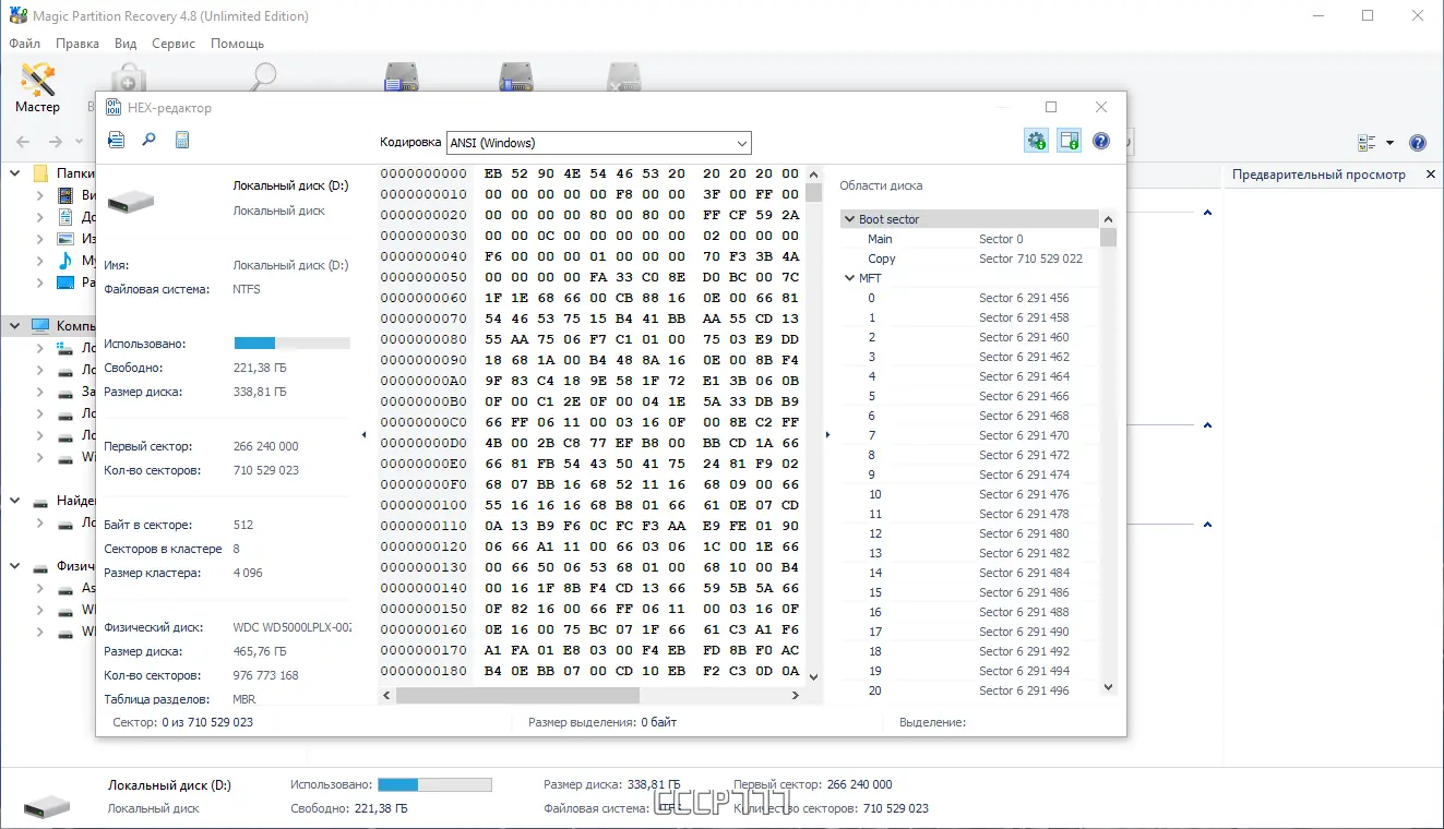 - Встроенный HEX-редактор даёт доступ к низкоуровневым данным разделов и секторов диска.