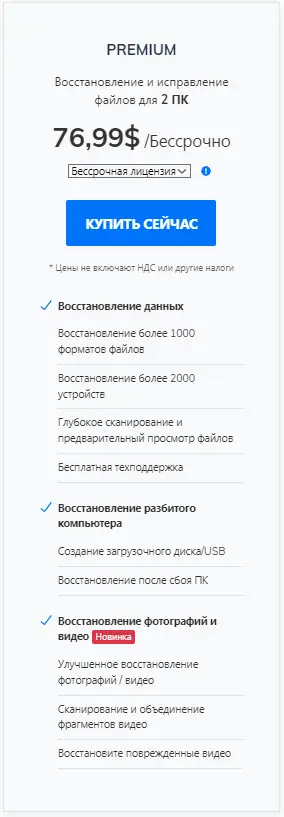 - Полный функционал доступен только в платной версии, а бесплатная версия ограничена по объёму восстановления.