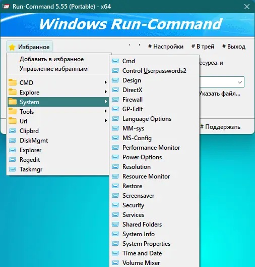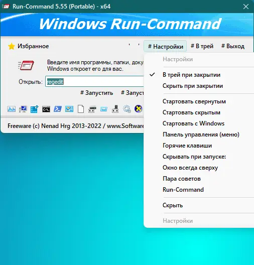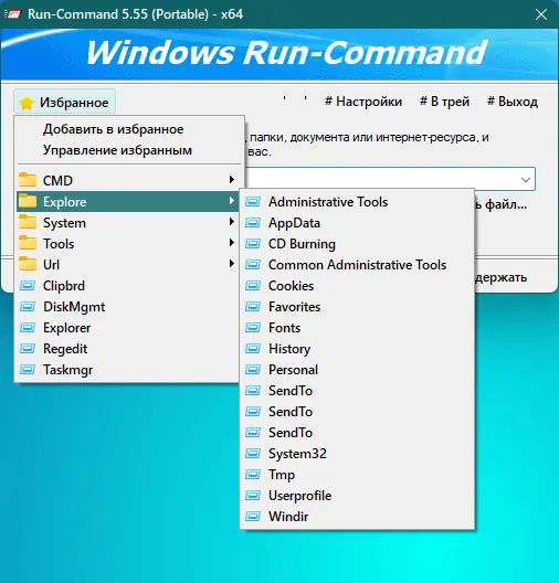 Run-Command — это компактная утилита для Windows, призванная заменить стандартное окно «Выполнить» с расширенными возможностями. Программа позволяет быстро запускать команды, работать с реестром, управлять избранными действиями и выполнять задачи от имени администратора без лишних шагов. Её минималистичный интерфейс скрывает мощный функционал, ориентированный на пользователей, ценящих скорость и эффективность.