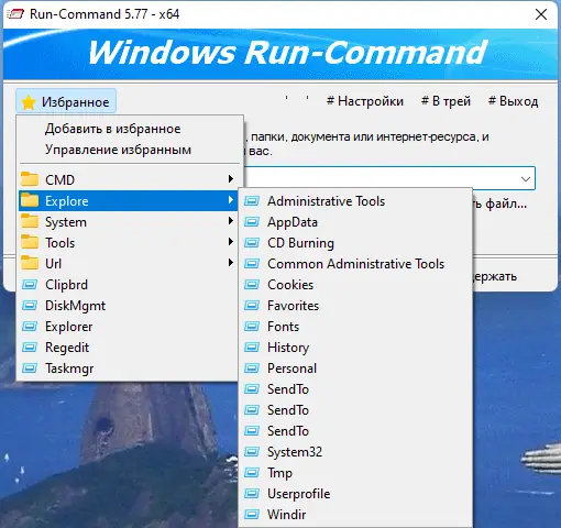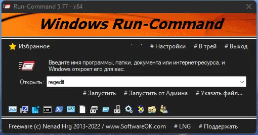 После запуска программы открывается небольшое окно с полем ввода, аналогичное стандартному «Выполнить», но с рядом улучшений. Под строкой ввода расположены пять иконок быстрого доступа к часто используемым компонентам: реестру, командной строке, PowerShell, службам и диспетчеру задач. Для запуска команды от имени администратора достаточно нажать соответствующую кнопку или использовать контекстное меню. Добавление команд в избранное осуществляется через кнопку «Добавить в избранное», после чего можно задать имя, категорию и горячую клавишу. Сохранённые команды доступны через выпадающий список или прямой вызов, что значительно ускоряет повседневные задачи.