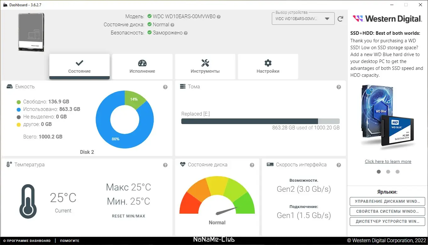 SanDisk SSD Dashboard — это официальное приложение от Western Digital для мониторинга, диагностики и обслуживания твердотельных накопителей SanDisk и WD. Программа предоставляет детальную информацию о состоянии диска, включая температуру, ресурс износа и производительность, а также позволяет проводить тестирование, обновлять прошивку и безопасно удалять данные.