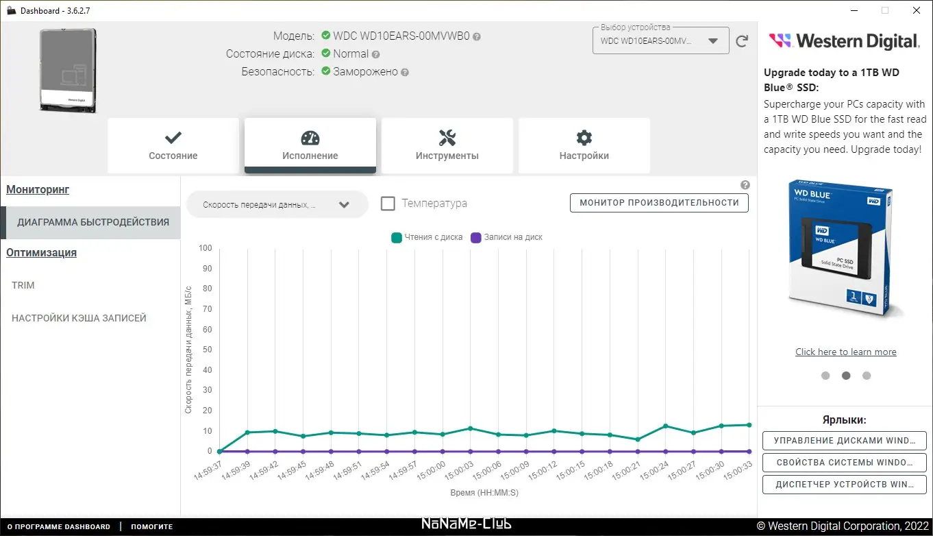 SanDisk SSD Dashboard разработана для пользователей, стремящихся поддерживать SSD в оптимальном состоянии. Программное обеспечение совместимо с широким спектром накопителей SanDisk и, начиная с версии 2.5.1.0, также поддерживает диски Western Digital. Интерфейс интуитивно понятен и отображает ключевые параметры в реальном времени, включая скорость чтения и записи, показатели ввода-вывода и текущую температуру. Это позволяет своевременно выявлять потенциальные проблемы и предотвращать сбои.