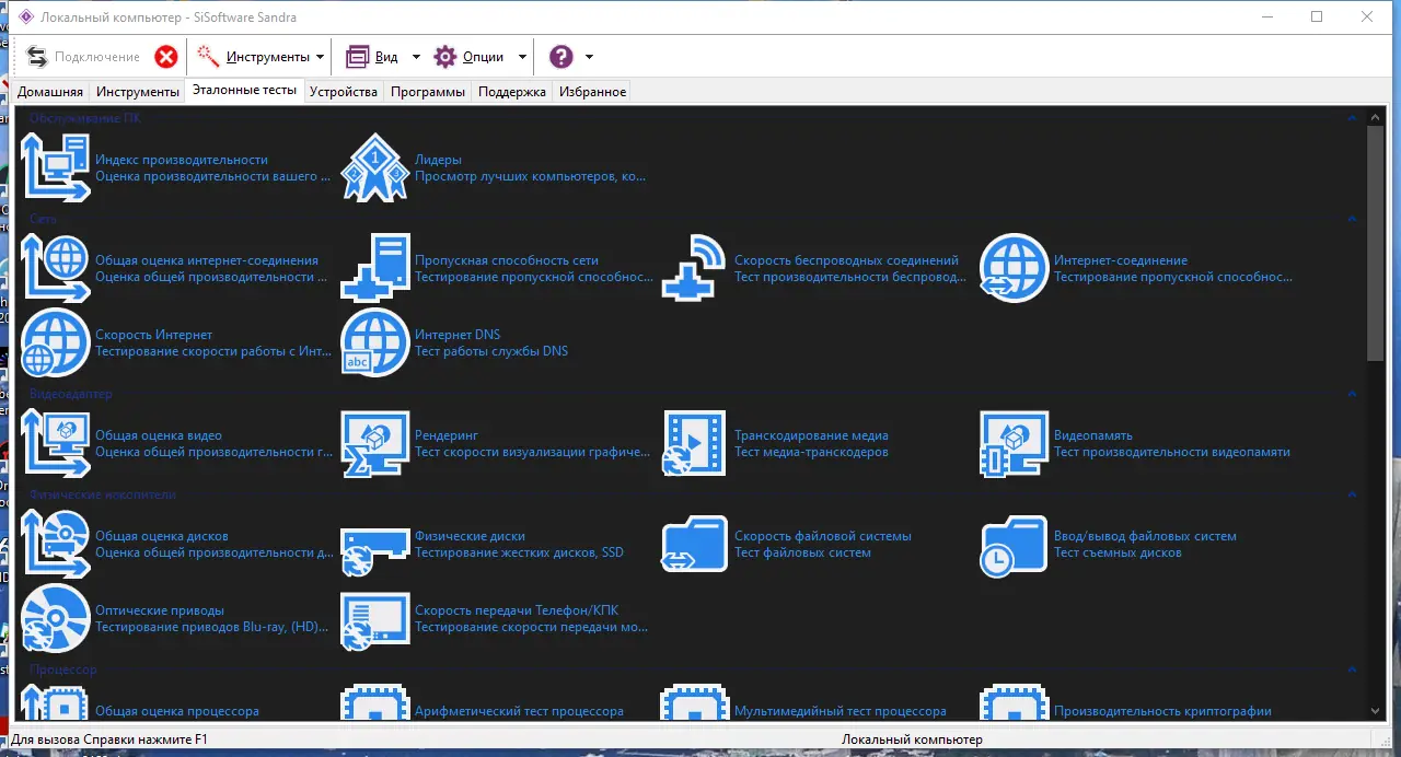 Интерфейс SiSoftware Sandra организован в виде панели модулей, каждый из которых открывается отдельно. Пользователь выбирает нужную категорию — например, «Процессор», «Память» или «Сеть» — и запускает соответствующий тест. По завершении отображаются результаты в числовом виде и на графиках, что упрощает визуальное сравнение.