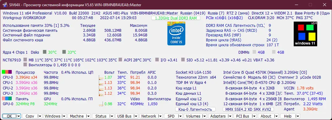 SIV (System Information Viewer) предоставляет исчерпывающие сведения о конфигурации компьютера, включая процессор, оперативную память, видеокарту, накопители и подключённые устройства. Интерфейс утилиты организован по модульному принципу, где каждый раздел отвечает за определённый аспект системы. Это позволяет быстро находить нужные параметры и анализировать их без лишних действий.
