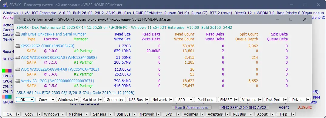 Как пользоваться программой: после запуска SIV автоматически начинает сбор данных о системе. Основное окно разделено на вкладки — каждая отвечает за определённый тип информации. На вкладке «CPU» отображаются характеристики процессора, включая загрузку по ядрам и энергопотребление. В разделе «Memory» можно отслеживать использование ОЗУ и файл подкачки. Модуль «Drives» показывает скорость дисков, тип подключения и уровень износа SSD. Для просмотра данных о сети используется вкладка «Network», где отображаются активные соединения и устройства в локальной сети. Настройки программы позволяют задавать частоту обновления данных, выбирать отображаемые параметры и сохранять отчёты в текстовом формате.