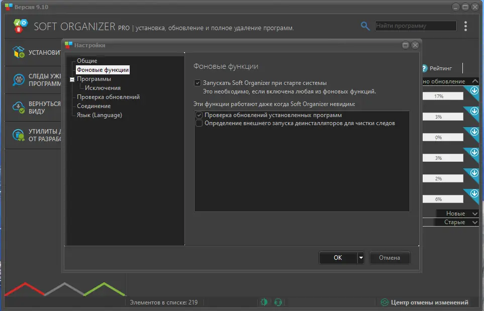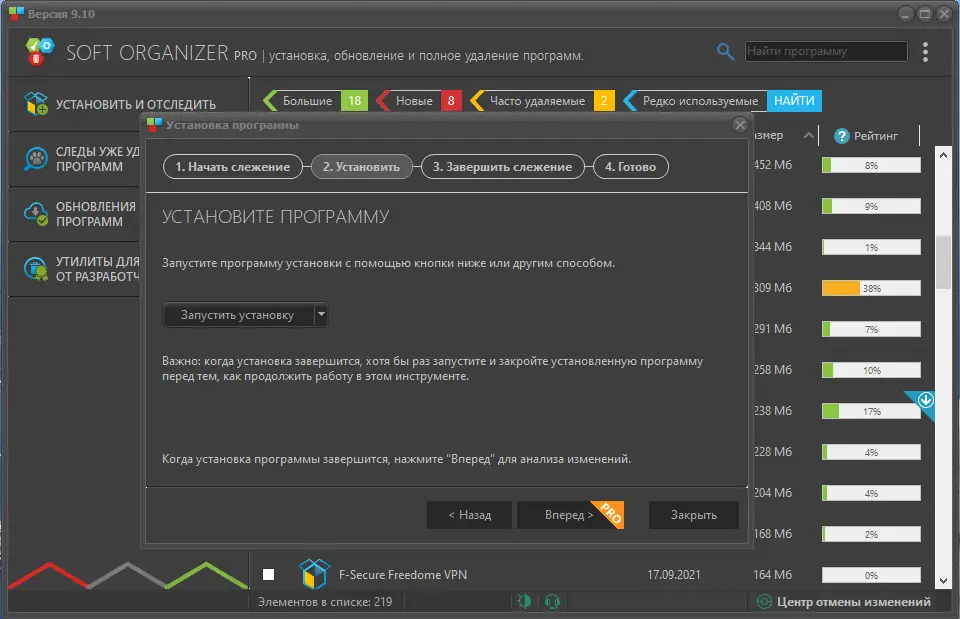 Использование программы начинается с отслеживания установки нового приложения. После запуска Soft Organizer переходит в режим мониторинга, и любые изменения в системе фиксируются автоматически. После завершения установки программа сохраняет всю информацию о созданных файлах, папках и записях реестра. В дальнейшем, при необходимости удалить приложение, достаточно выбрать его из списка и нажать кнопку удаления. Утилита не только запускает штатный деинсталлятор, но и дополняет процесс зачисткой всех остатков. Также доступна функция проверки обновлений — Soft Organizer сообщает, если для установленной программы вышла новая версия. Для опытных пользователей предусмотрена возможность импорта файла настроек и списка исключений, что позволяет настроить поведение утилиты под конкретные нужды.
