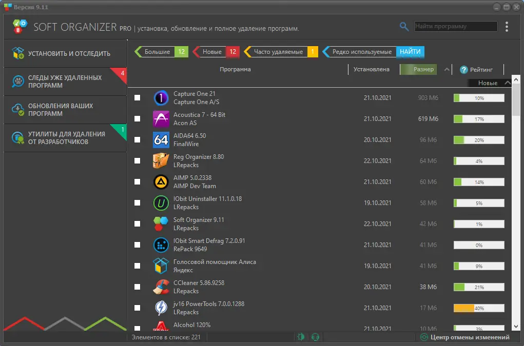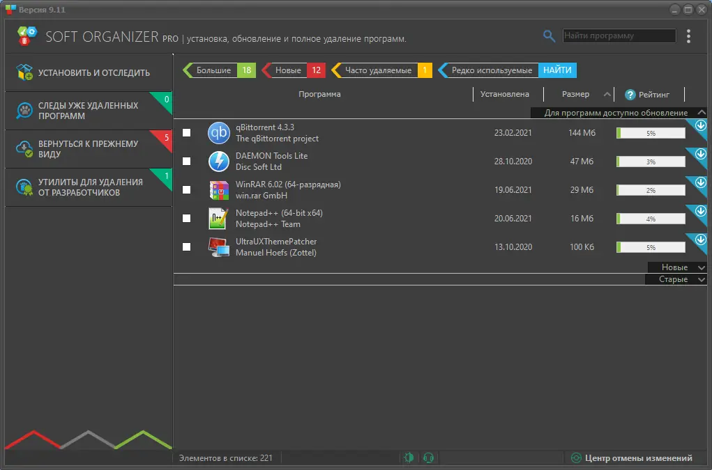Soft Organizer — это эффективная утилита для полного удаления программ из операционной системы. В отличие от стандартного деинсталлятора Windows, она удаляет не только основные компоненты приложений, но и все следы: временные файлы, папки в системных директориях, записи в реестре и остатки настроек. Это помогает освободить место на диске и поддерживать систему в чистоте, предотвращая накопление мусора.