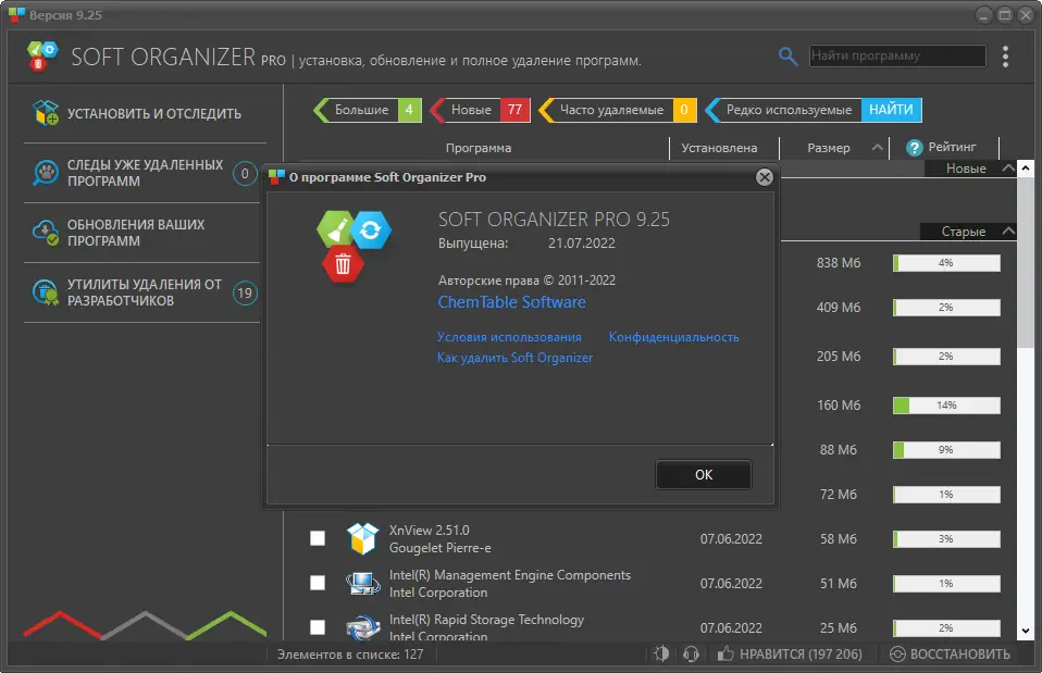 Soft Organizer — это инструмент для полного удаления программ с компьютера, способный очистить систему от остатков, которые остаются после стандартного деинсталлятора. Утилита отслеживает изменения в реестре и файловой системе в момент установки приложений, обеспечивая чистое удаление без следов.