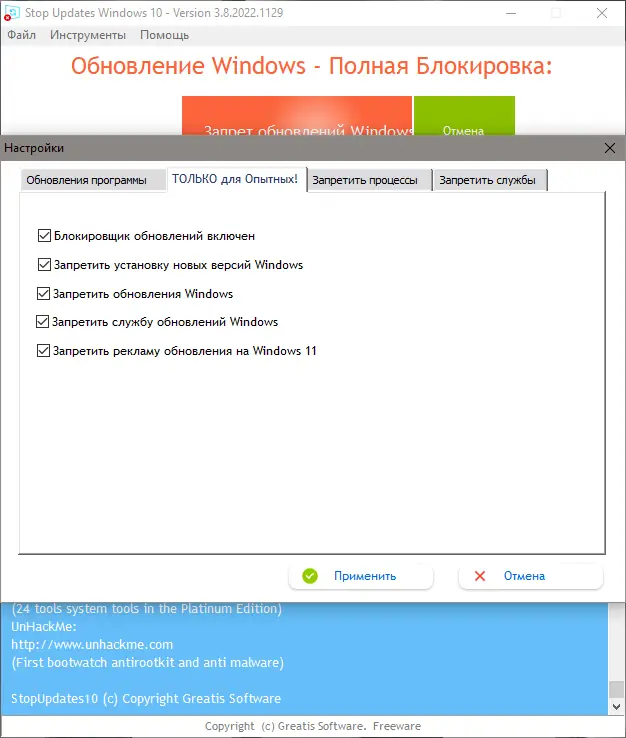 Программа не вносит необратимых изменений и обеспечивает безопасное управление обновлениями.