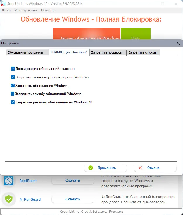 - Блокирует автоматическую загрузку и установку обновлений Windows.