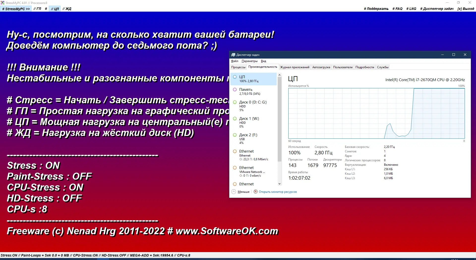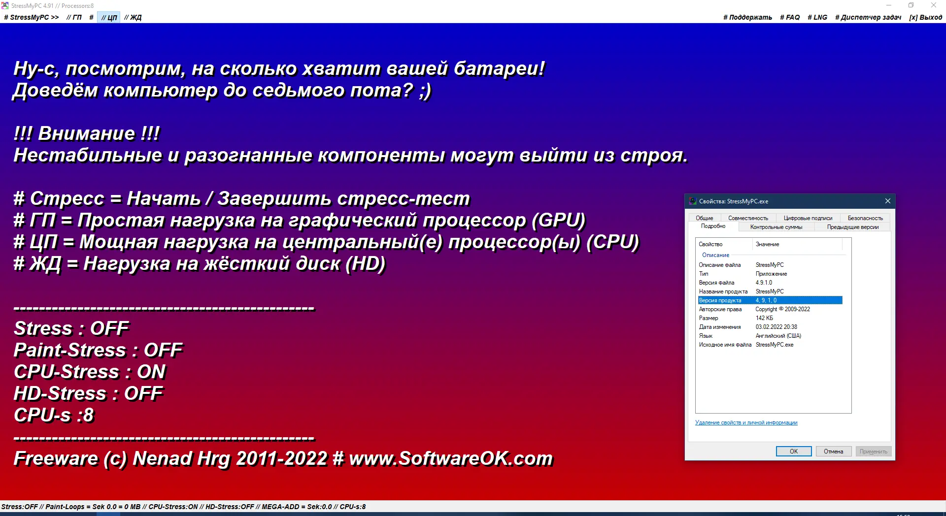 StressMyPC — это компактная утилита для стресс-тестирования всех ключевых компонентов компьютера, включая процессор, видеокарту и жесткие диски. Программа помогает оценить стабильность системы под высокой нагрузкой и проверить эффективность охлаждения, а также время автономной работы ноутбуков.