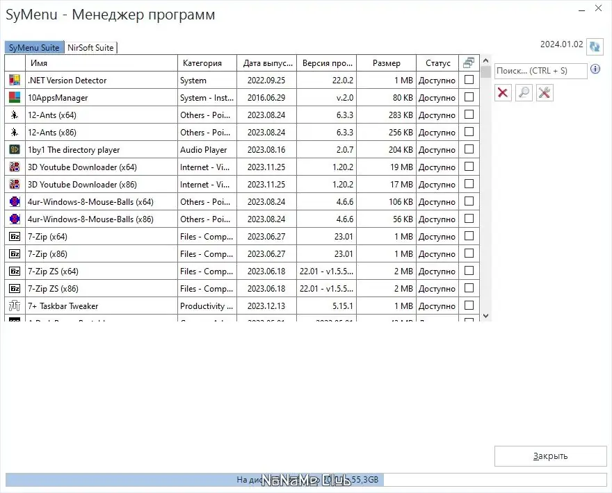 - Встроенный менеджер приложений даёт возможность скачивать утилиты из проверенных наборов — SyMenu suite, NirSoft suite и Sysinternals suite.