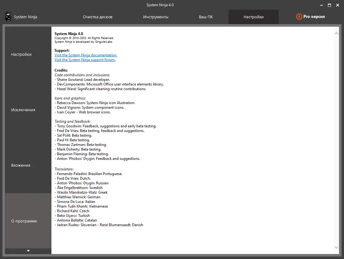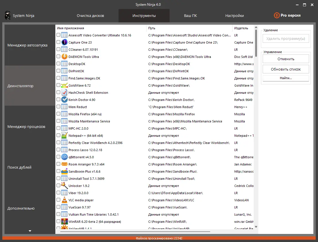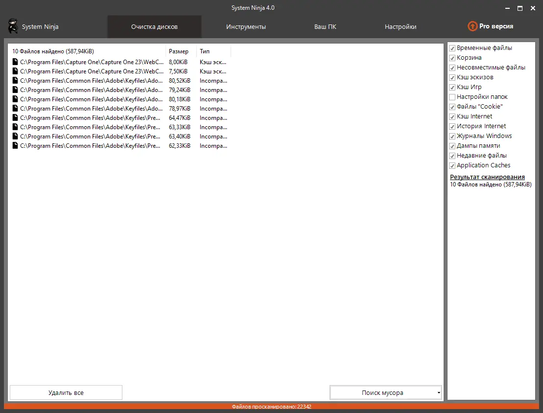 System Ninja — это мощная бесплатная утилита для очистки системы от временных файлов, остатков программ и других видов цифрового мусора. Программа эффективно сканирует весь диск, выявляя скрытые ненужные данные, и предоставляет пользователю полный контроль над процессом удаления. Благодаря продуманному интерфейсу и расширенным функциям, утилита подходит как для новичков, так и для опытных пользователей, стремящихся поддерживать систему в идеальном состоянии.