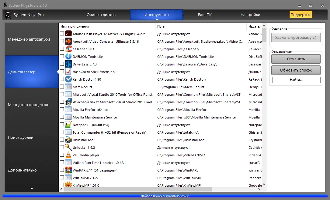 Особенность System Ninja — анализ всей файловой системы, а не только стандартных директорий, что обеспечивает более полную очистку.