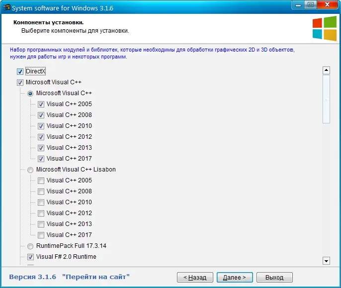 System software for Windows представляет собой набор распространяемых пакетов и системных библиотек, объединённых в едином установщике для удобства настройки компьютера. Программа предназначена для пользователей, сталкивающихся с проблемами запуска игр, приложений или мультимедийного контента из-за отсутствия необходимых компонентов. Она особенно полезна после чистовой установки Windows, когда система ещё не содержит сторонних библиотек.