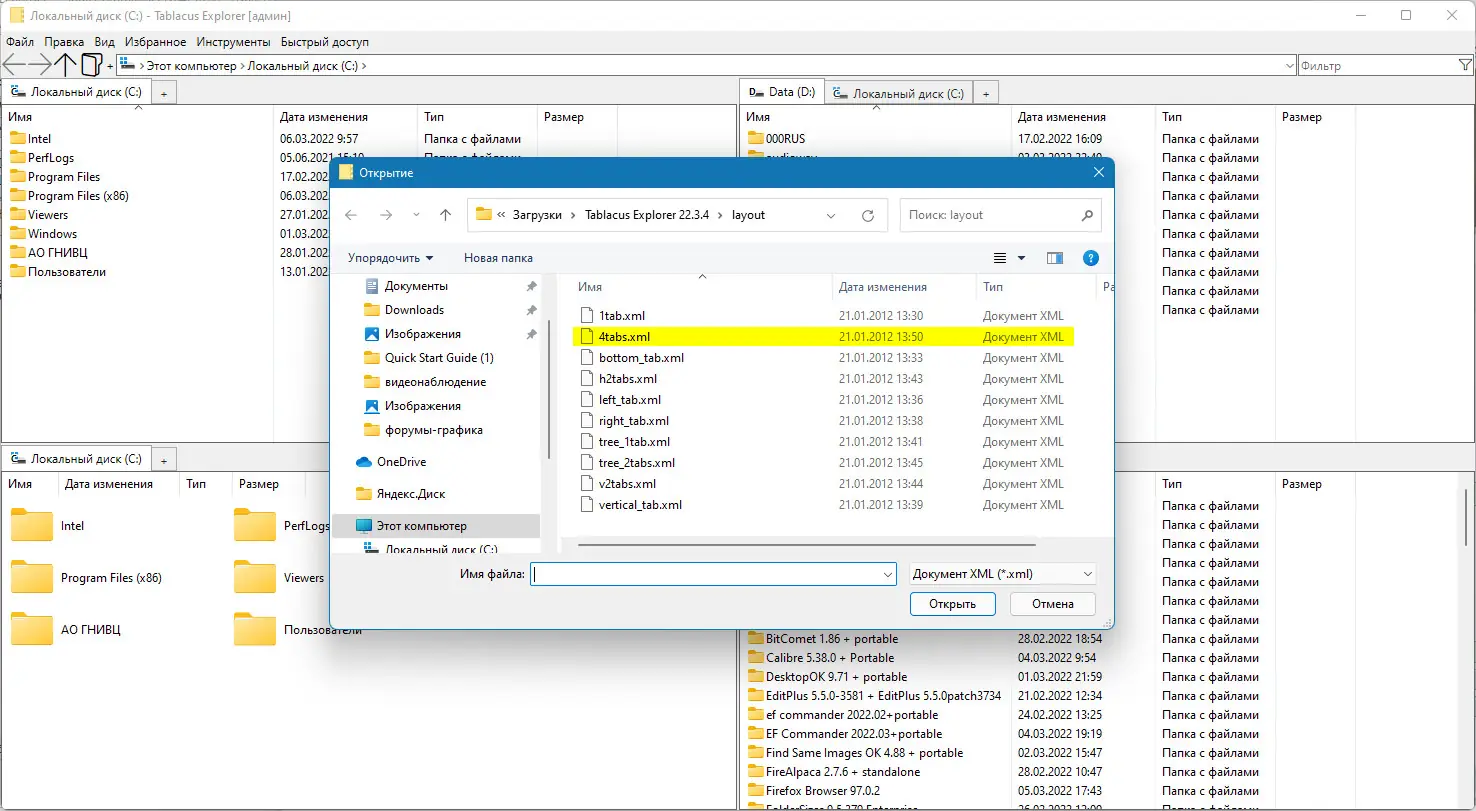 Tablacus Explorer представляет собой альтернативу стандартному проводнику Windows, сочетающую простоту интерфейса с расширенными возможностями. Программа поддерживает двух- и четырёхпанельный режимы, а также работу с множеством вкладок, что упрощает одновременное управление несколькими каталогами. Каждая вкладка может быть открыта в отдельном окне или на общей панели, обеспечивая гибкость при работе с большим количеством файлов.