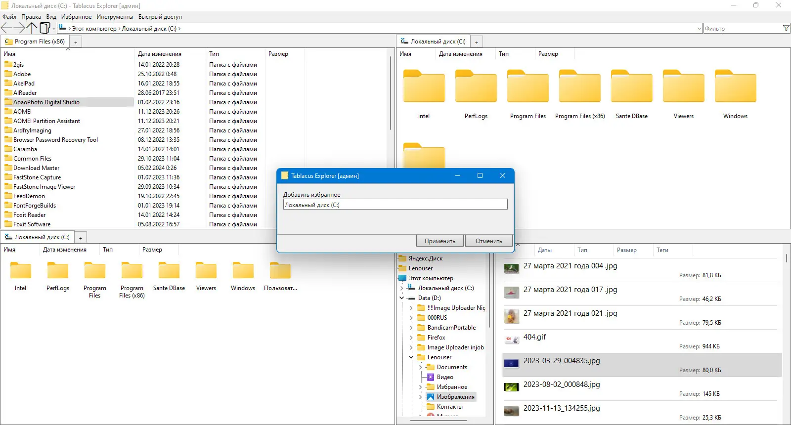 Tablacus Explorer представляет собой альтернативный файловый менеджер, ориентированный на пользователей, которым не хватает функций стандартного проводника Windows, но не хочется переходить на громоздкие двухпанельные решения. Программа поддерживает двух- и четырёхпанельный режимы, а также работу с несколькими вкладками на каждой панели, что значительно ускоряет навигацию между каталогами. Её интерфейс минималистичен, но при этом легко настраивается под нужды пользователя. Благодаря встроенной поддержке расширений, функционал может быть расширен в зависимости от задач.