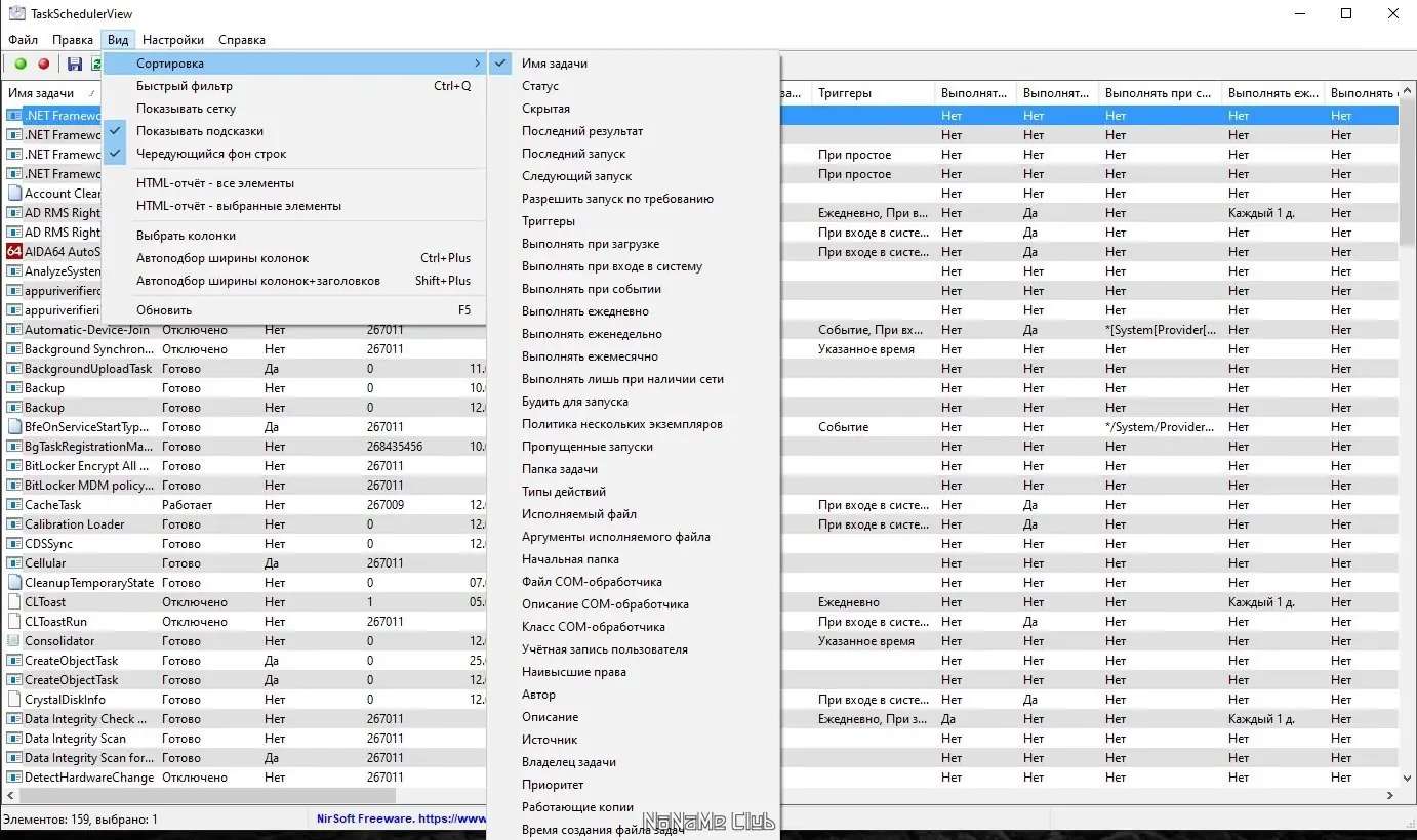 Запуск программы происходит мгновенно — достаточно открыть исполняемый файл. После старта отображается таблица со всеми зарегистрированными задачами, отсортированными по умолчанию по имени. Пользователь может изменить порядок сортировки, используя кнопку «Sort By» на панели инструментов, что позволяет быстро находить нужные элементы. Для управления задачей достаточно выделить её и воспользоваться контекстным меню или горячими клавишами — включить, отключить, открыть встроенную папку или просмотреть расписание запуска.