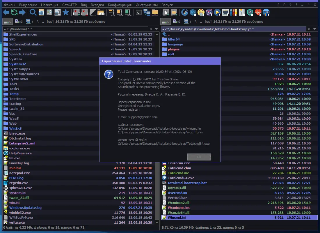Total Commander — это продвинутый файловый менеджер для операционной системы Windows, сочетающий в себе мощность, скорость и удобство управления файлами и папками. Программа построена по классической двухпанельной схеме, что позволяет эффективно копировать, перемещать и сравнивать содержимое каталогов. Благодаря поддержке плагинов, встроенных инструментов и расширенных функций, она подходит как для повседневного использования, так и для сложных задач администрирования. Программу можно использовать бесплатно в пробный период, после чего рекомендуется оформить лицензию. Интерфейс переведён на множество языков, включая русский, что делает её доступной для широкого круга пользователей.
