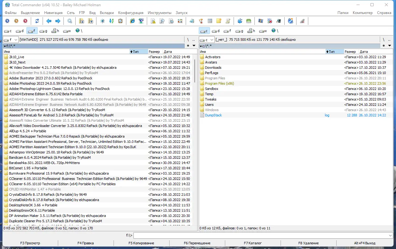 Total Commander — это мощный и гибкий файловый менеджер для операционной системы Windows, сочетающий в себе высокую производительность, стабильность и удобный интерфейс. Программа развивает концепцию двухпанельных оболочек, предлагая расширенные функции для управления файлами, включая работу с архивами, встроенные просмотрщики, поддержку плагинов и многопоточный доступ к сетевым ресурсам. Её эффективность особенно заметна при выполнении сложных операций с большим количеством данных.