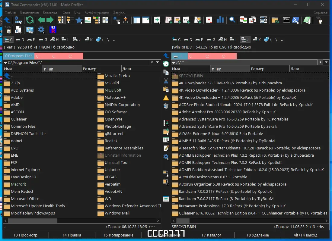 Портативная сборка Total Commander 11.01 с расширенным набором плагинов, скриптов и встроенных утилит для удобной и быстрой работы с файлами и папками. Программа поддерживает обе разрядности — x32 и x64 — и автоматически подстраивается под архитектуру операционной системы. В комплекте — мощные инструменты для просмотра, анализа и управления данными, включая встроенный медиаплеер, фильтры LAV, поддержку облачных хранилищ и расширенные функции поиска с помощью Everything. Сборка не требует установки и не оставляет следов в системе, что делает её идеальной для использования с флеш-накопителей.