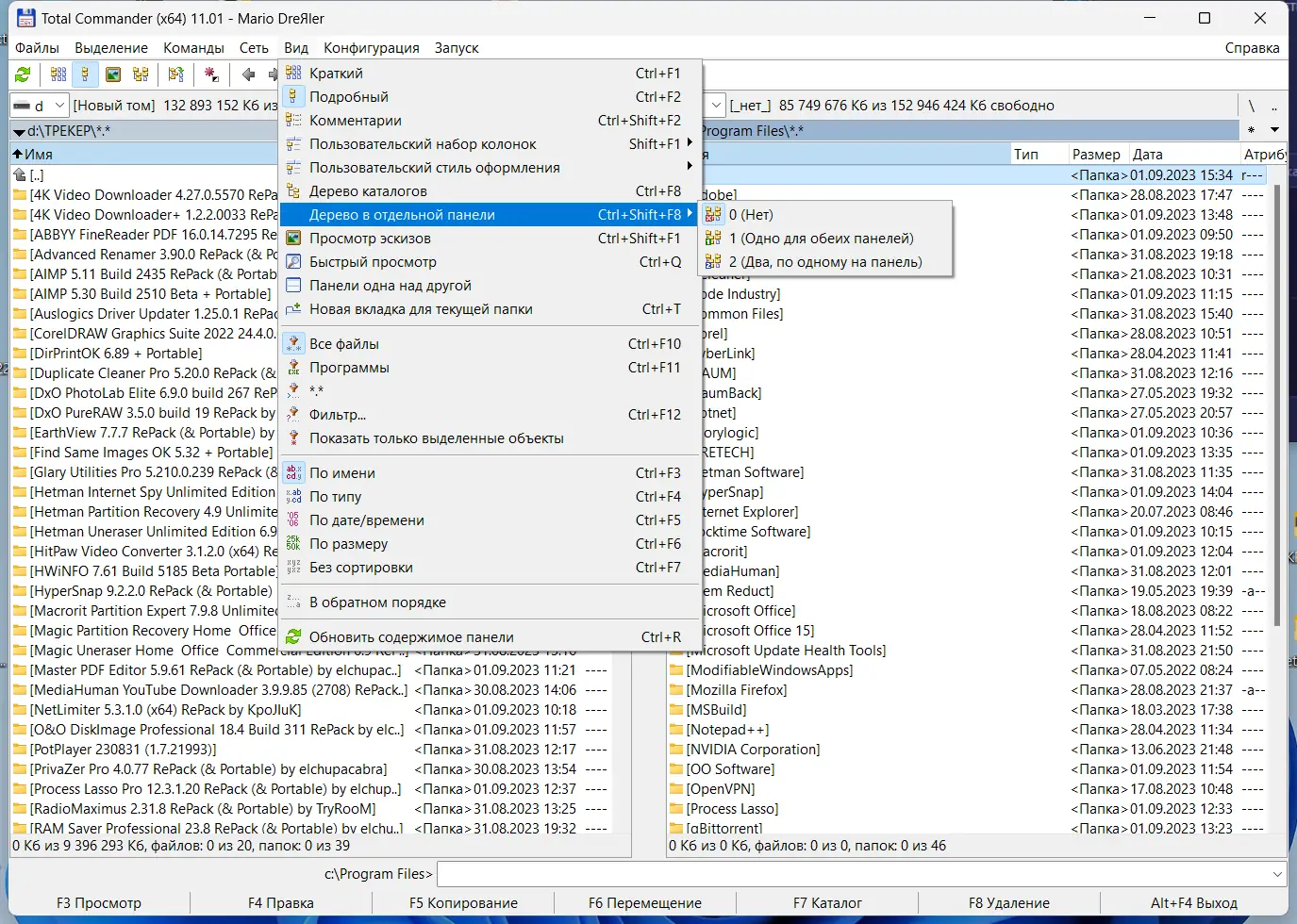 Двухпанельный интерфейс остаётся ключевой особенностью, позволяя одновременно работать с двумя директориями и ускоряя выполнение операций копирования и перемещения.