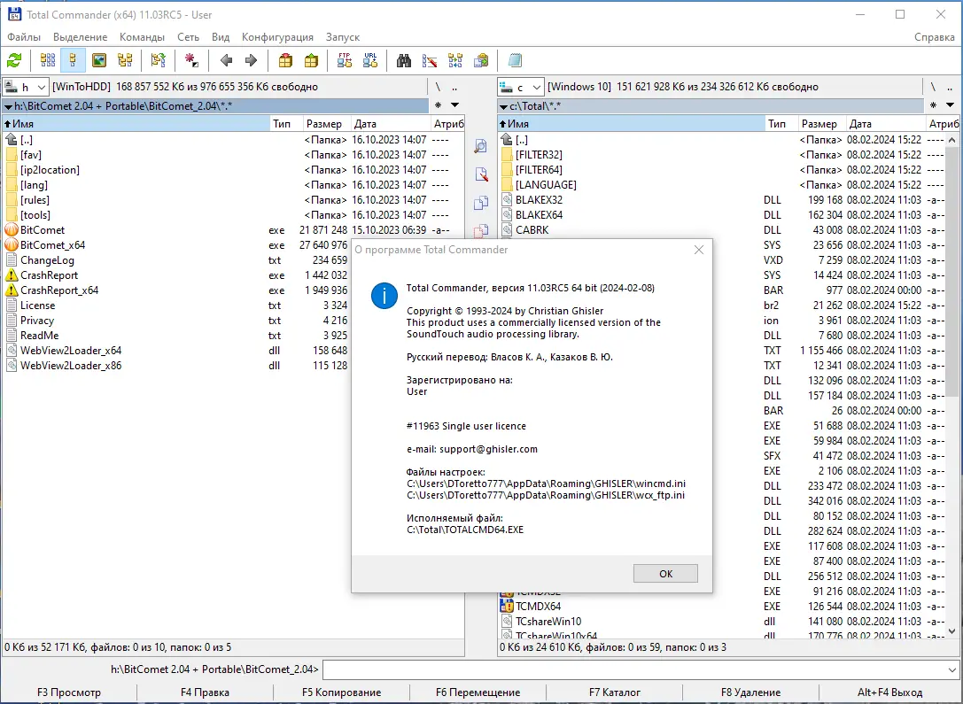 - Интерфейс с двумя панелями для одновременной навигации по разным каталогам.